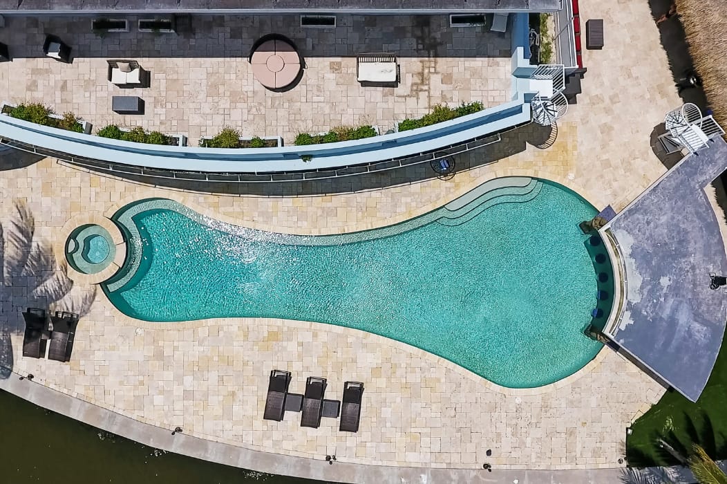 an immense 80 foot heated pool and jacuzzi marked by it’s stunning elliptical-hourglass shape as well as a