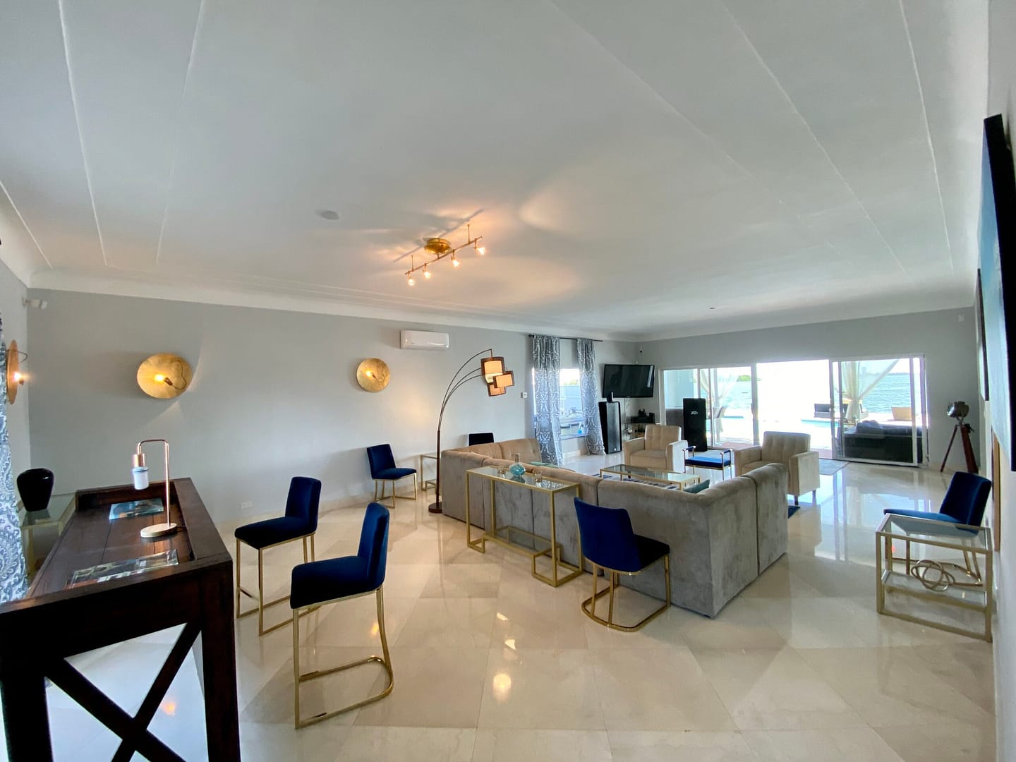 East Wing is a regal living room, featuring resplendent blue and gold accents, and a 70 inch television and professional sound to keep your guests entertained day and night.