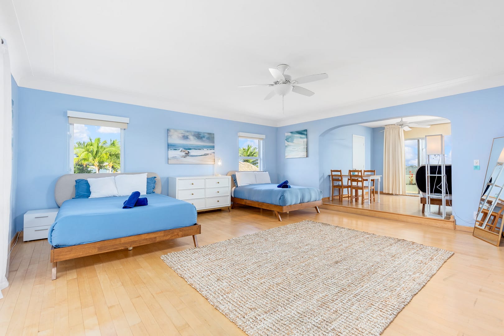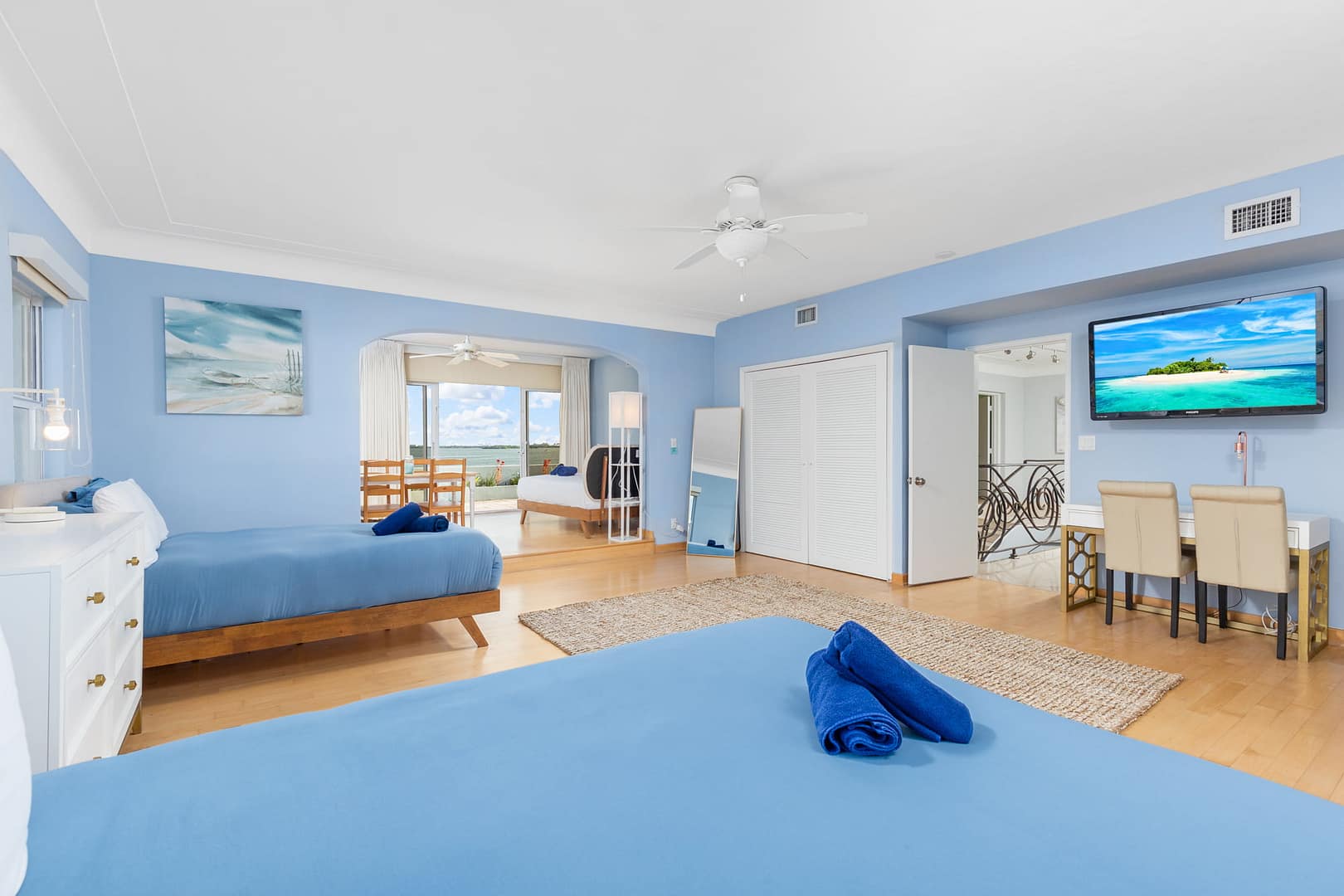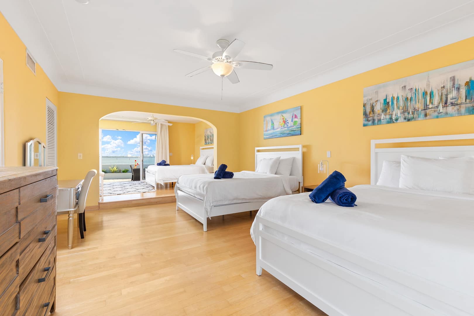 with 3 Queens and a full bath, while the Lime room features a Queen bed and full bath. Stunning Bay Views are
