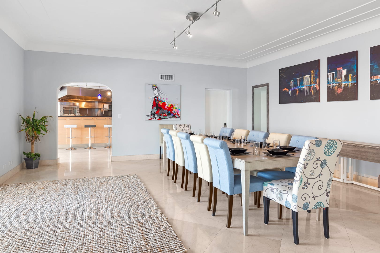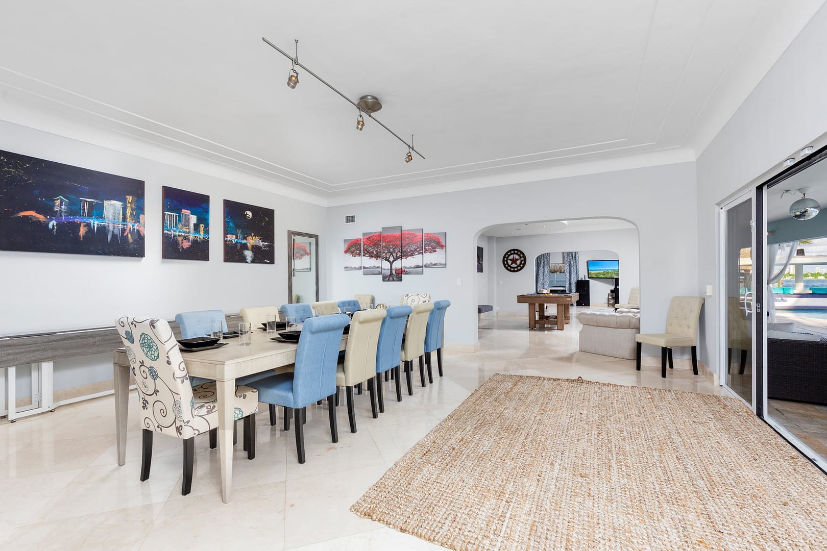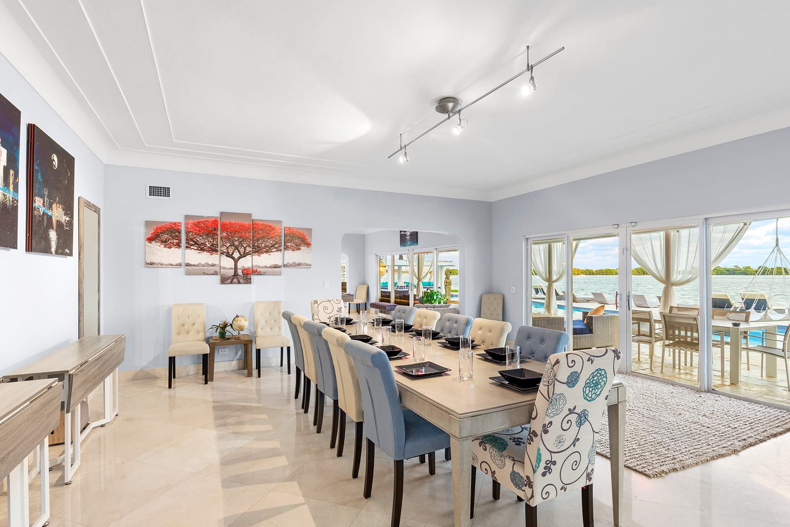 The dining room features a 14 person dinner table, with additional table seating for another 10. Adjacent to this is
