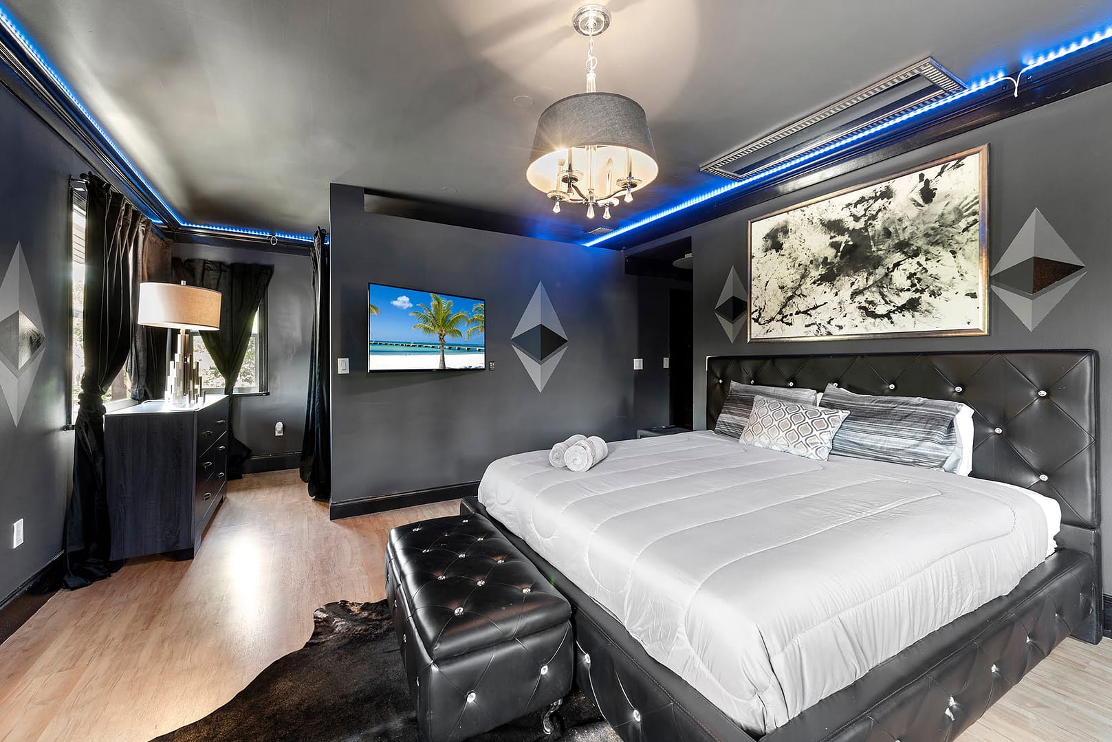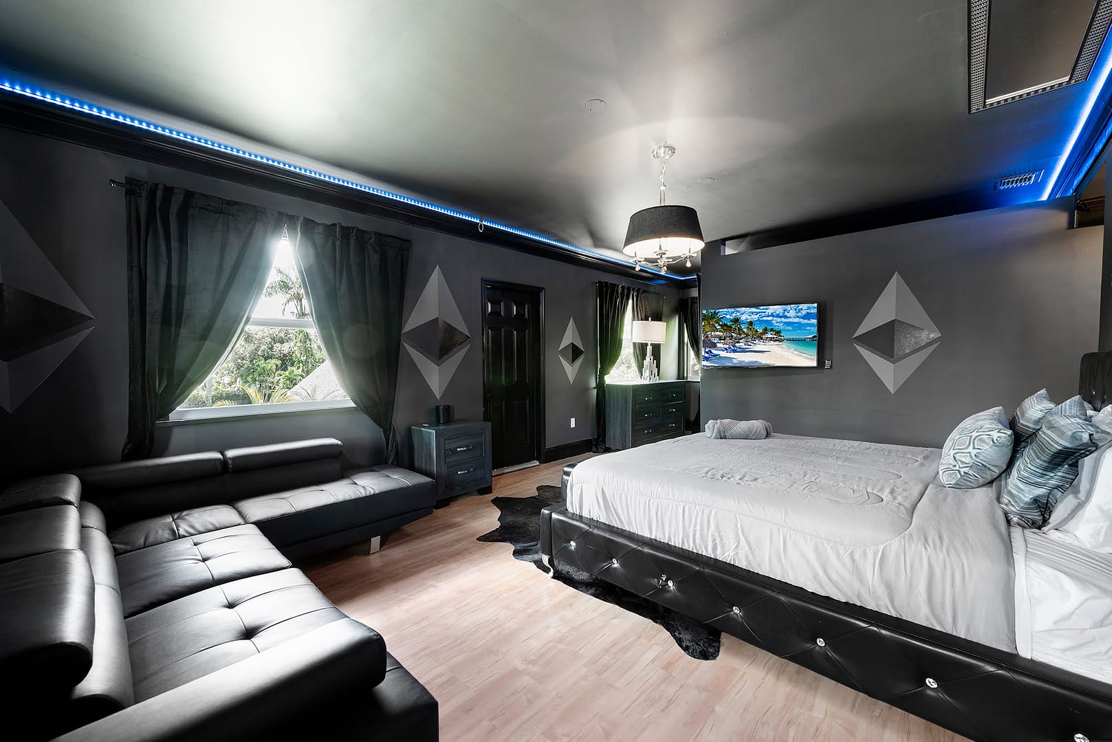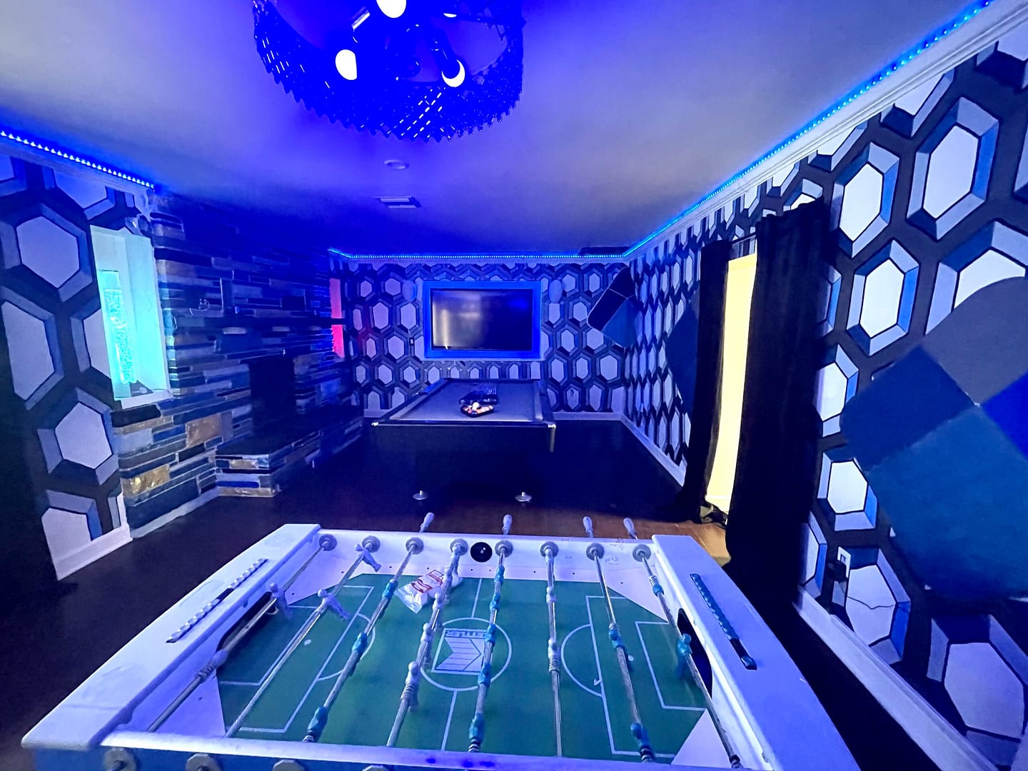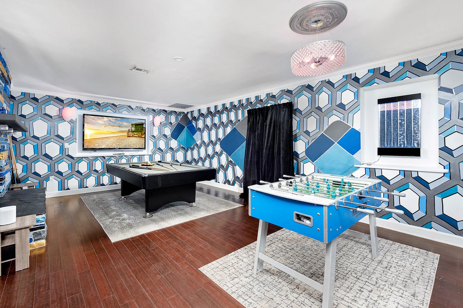 sleeping space with adjacent full bathroom. An electric and eclectic game room contains both pool