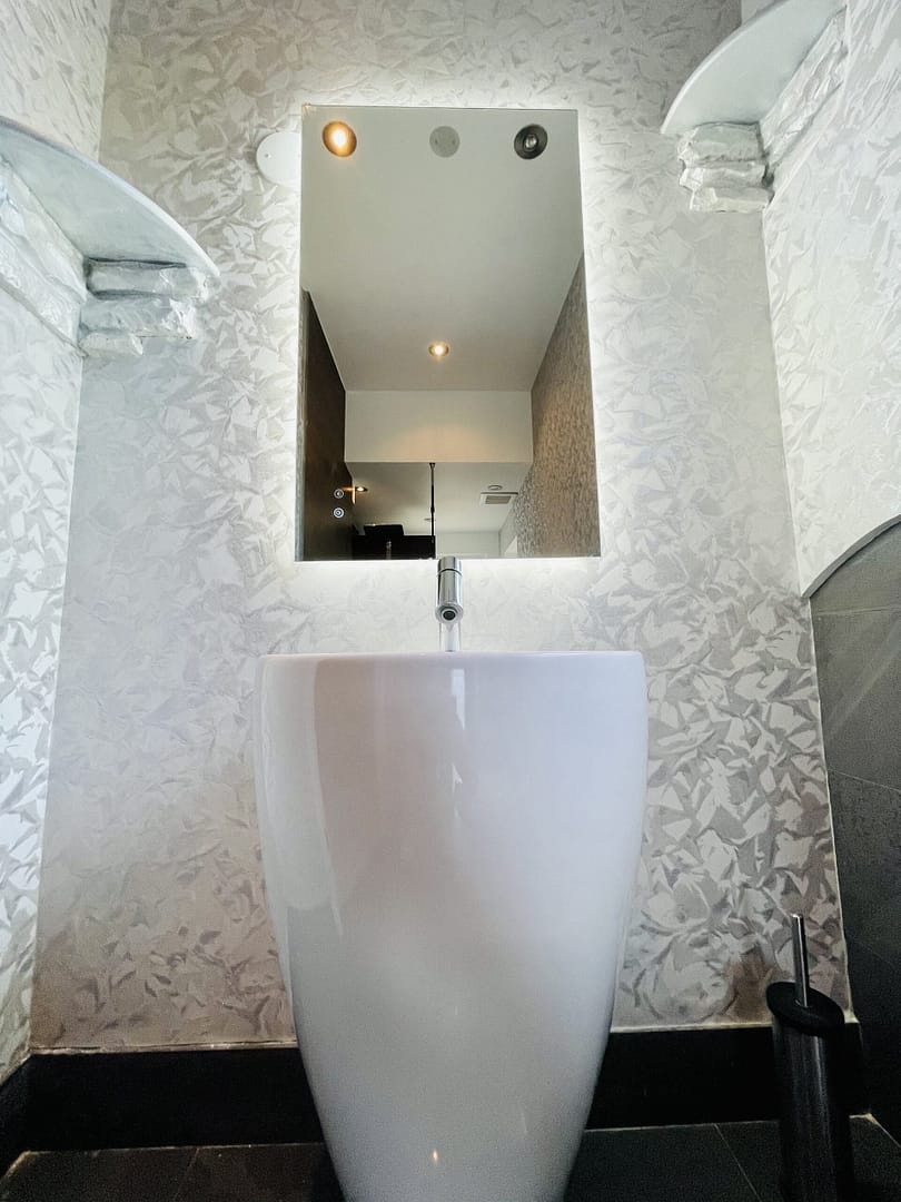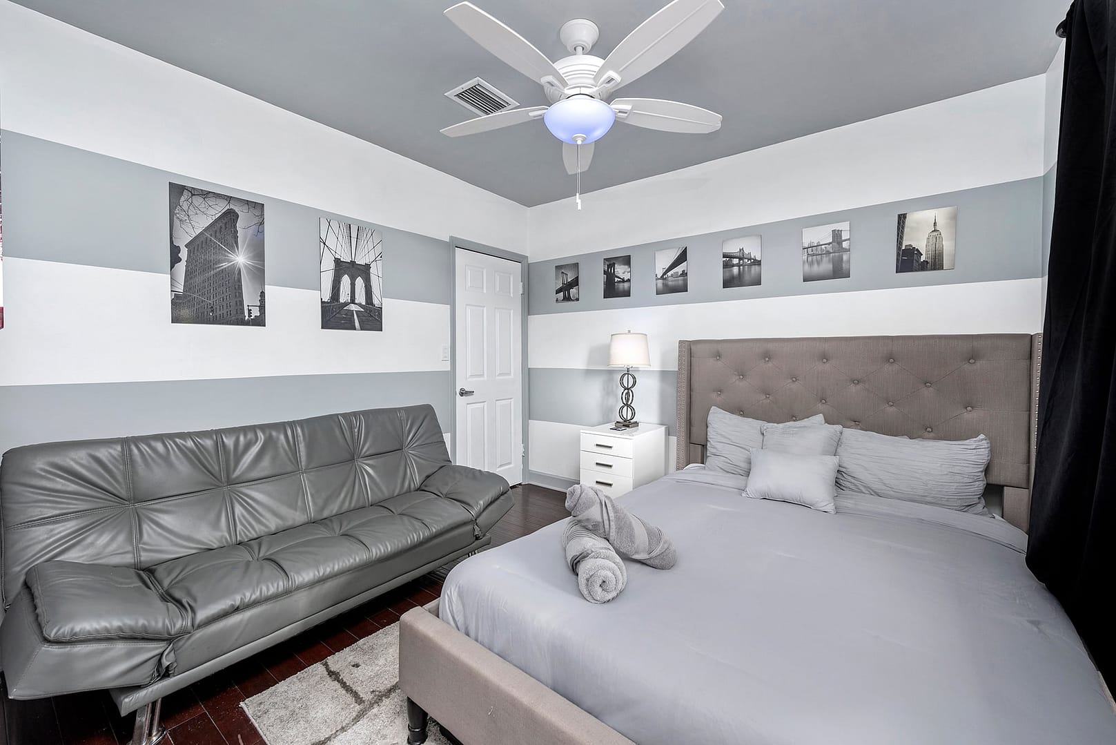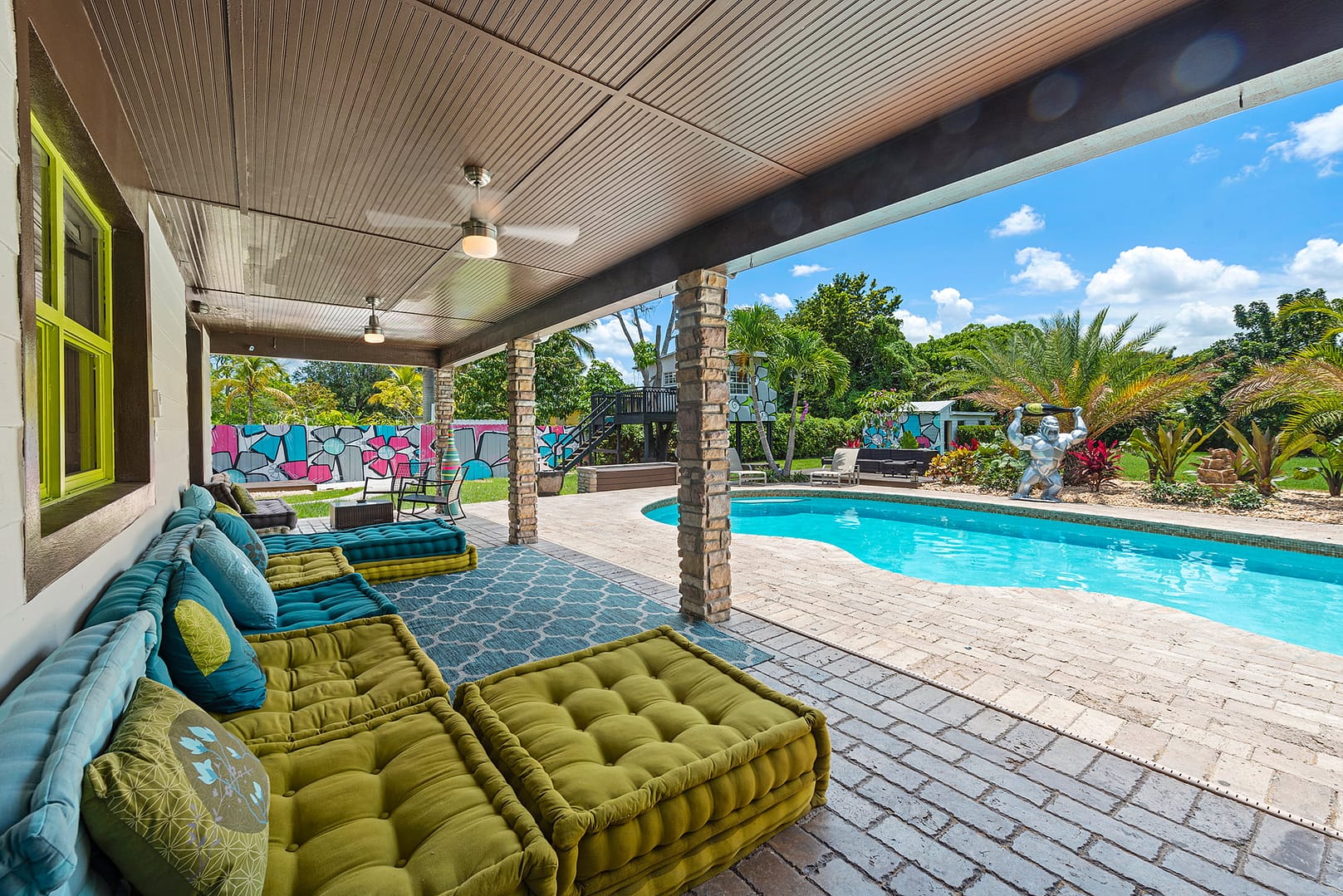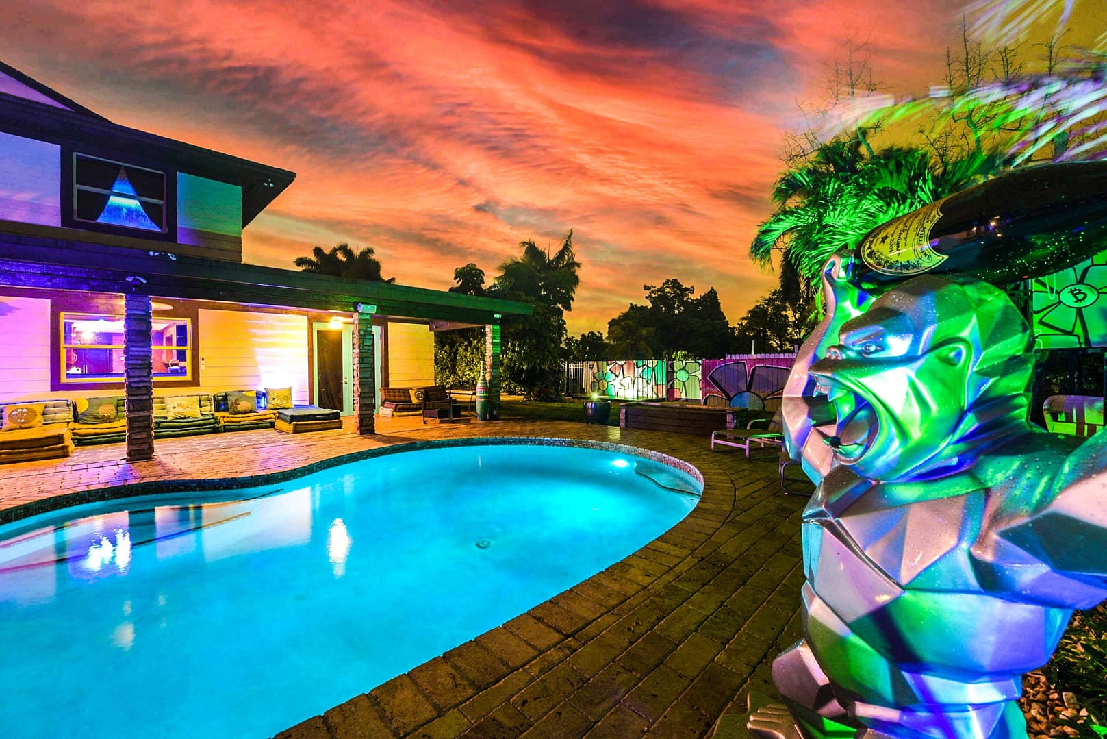 sleeping space with adjacent full bathroom. An electric and eclectic game room contains both pool