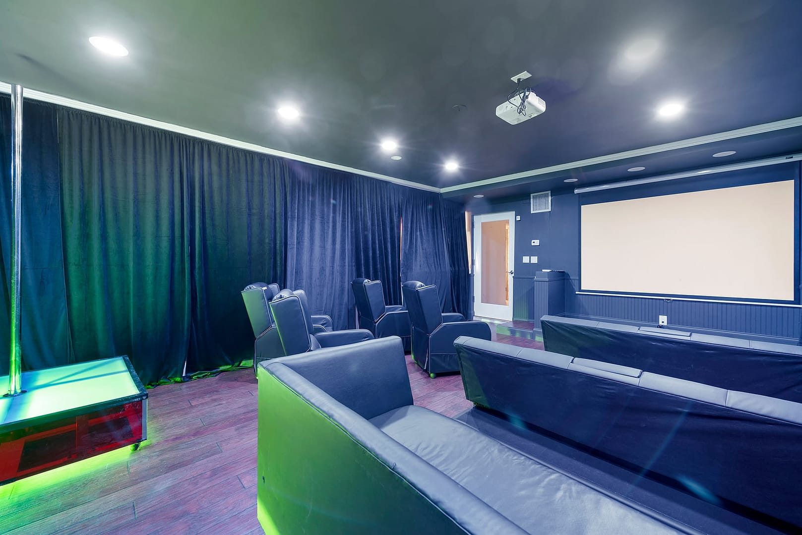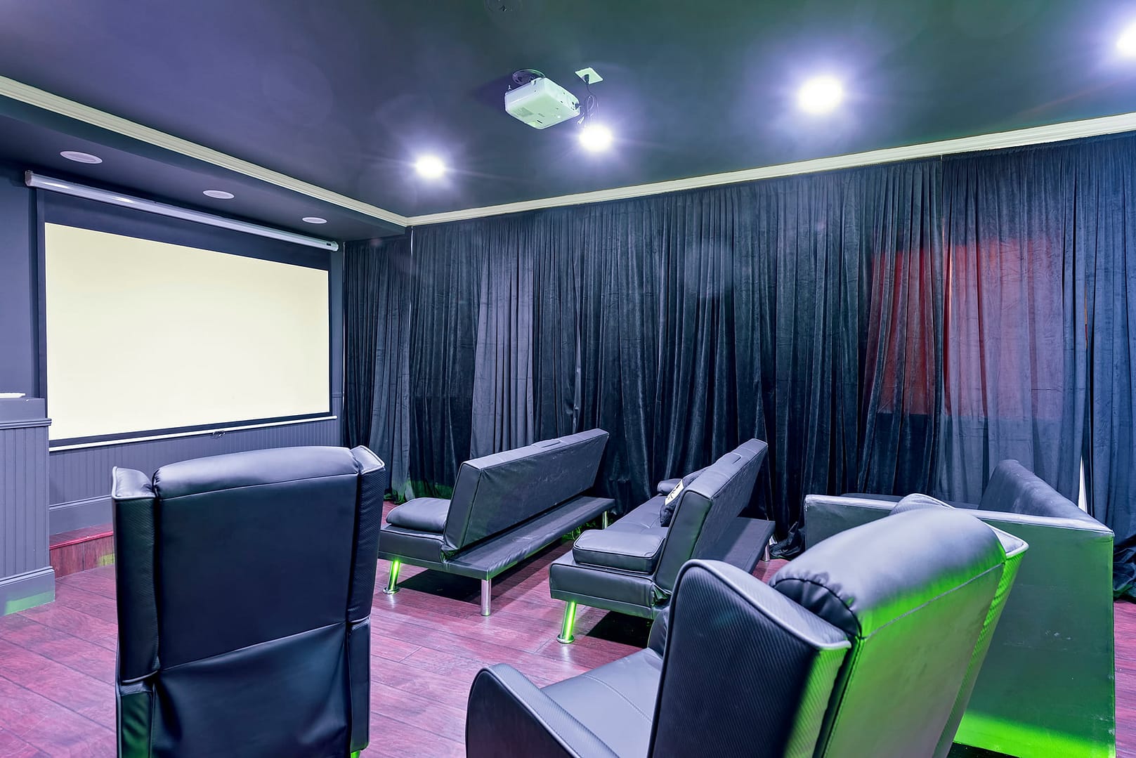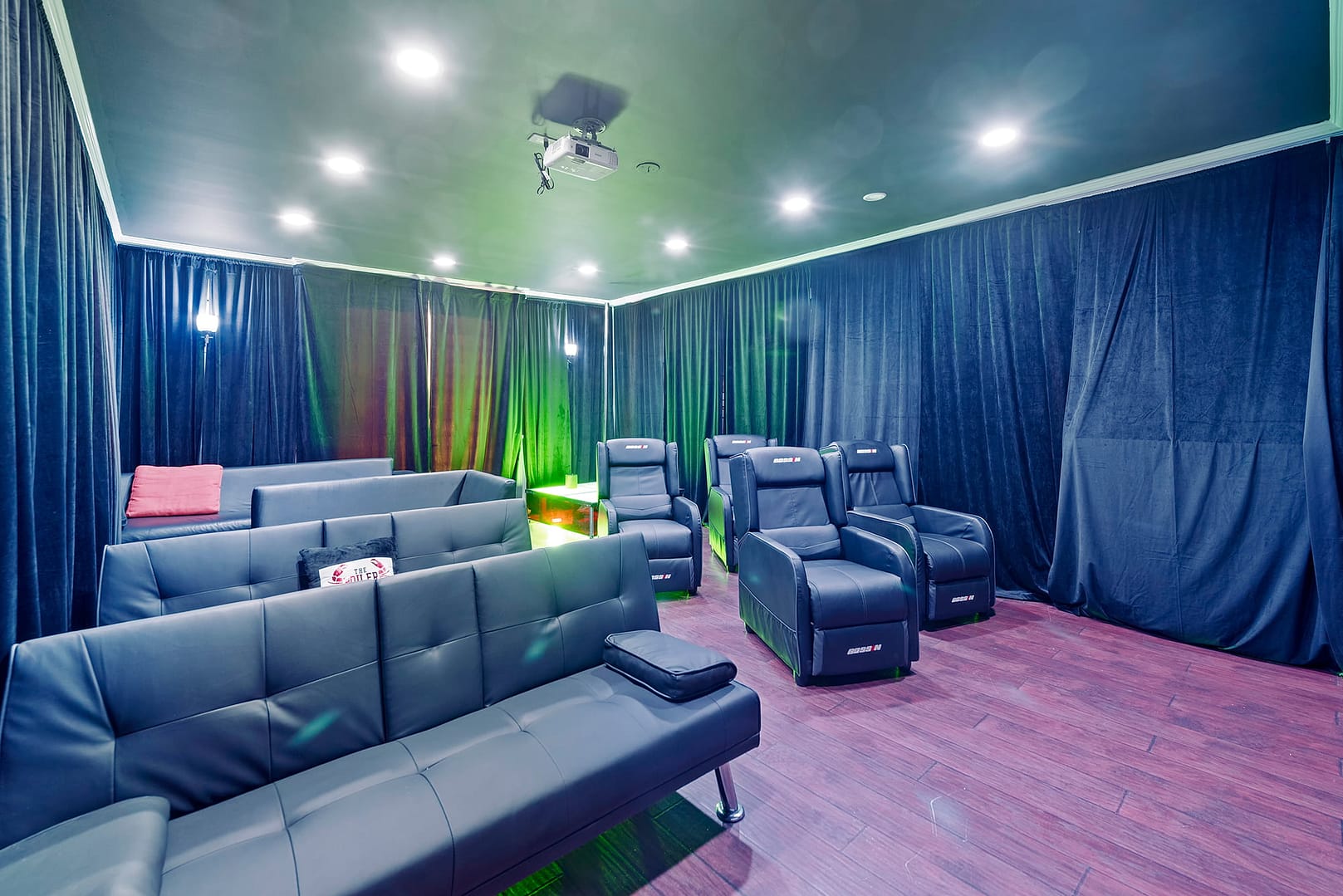master upstairs; downstairs are 3 bedrooms as well as a movie theater that doubles as an additional