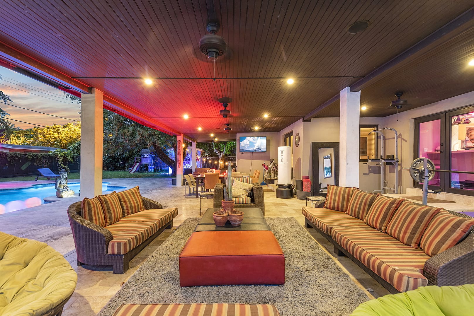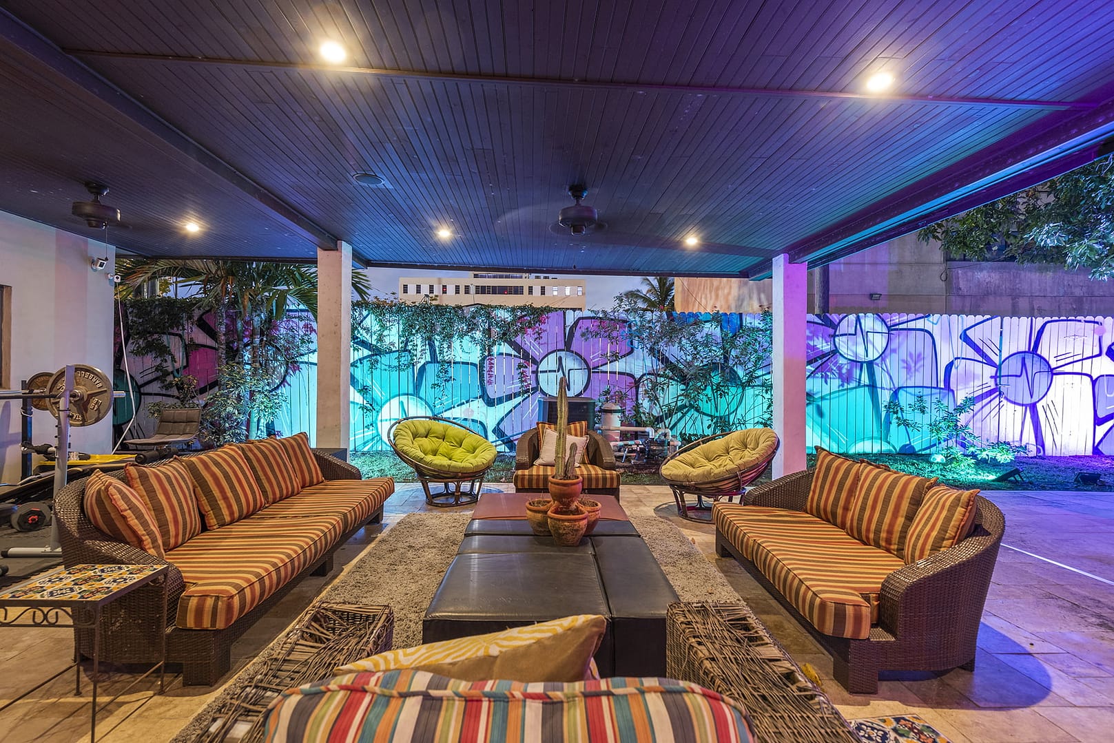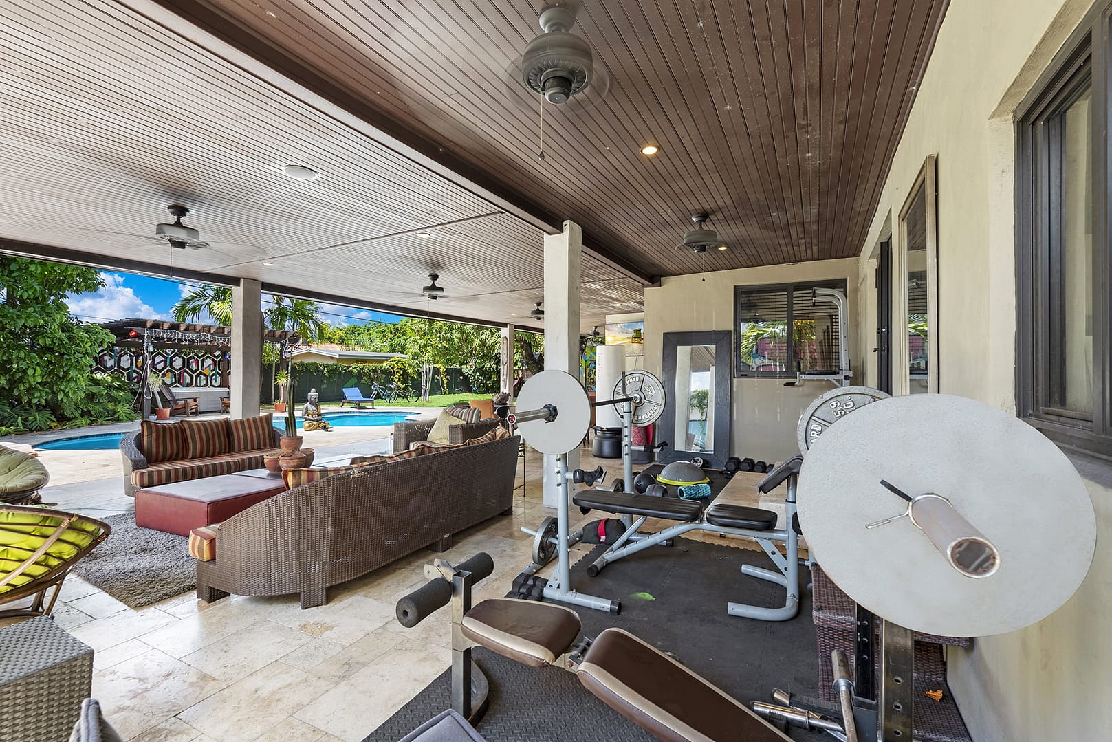 gym, outdoor patio that even in the middle of a downpour serves as an covered living