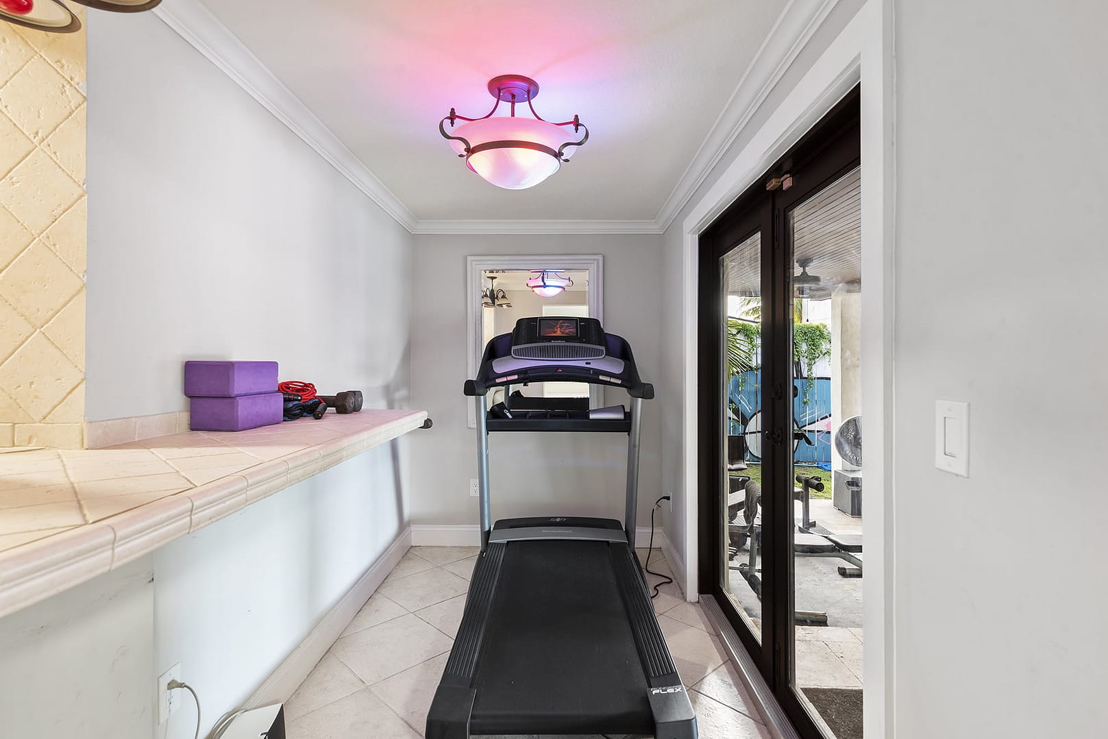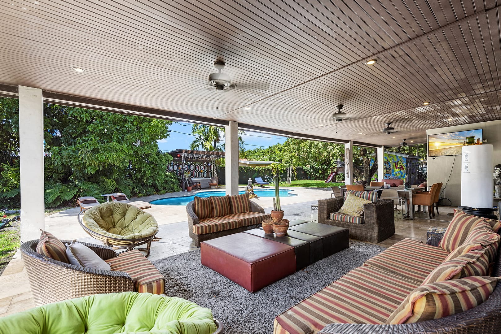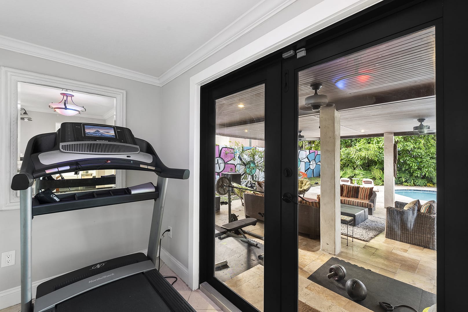 gym, outdoor patio that even in the middle of a downpour serves as an covered living
