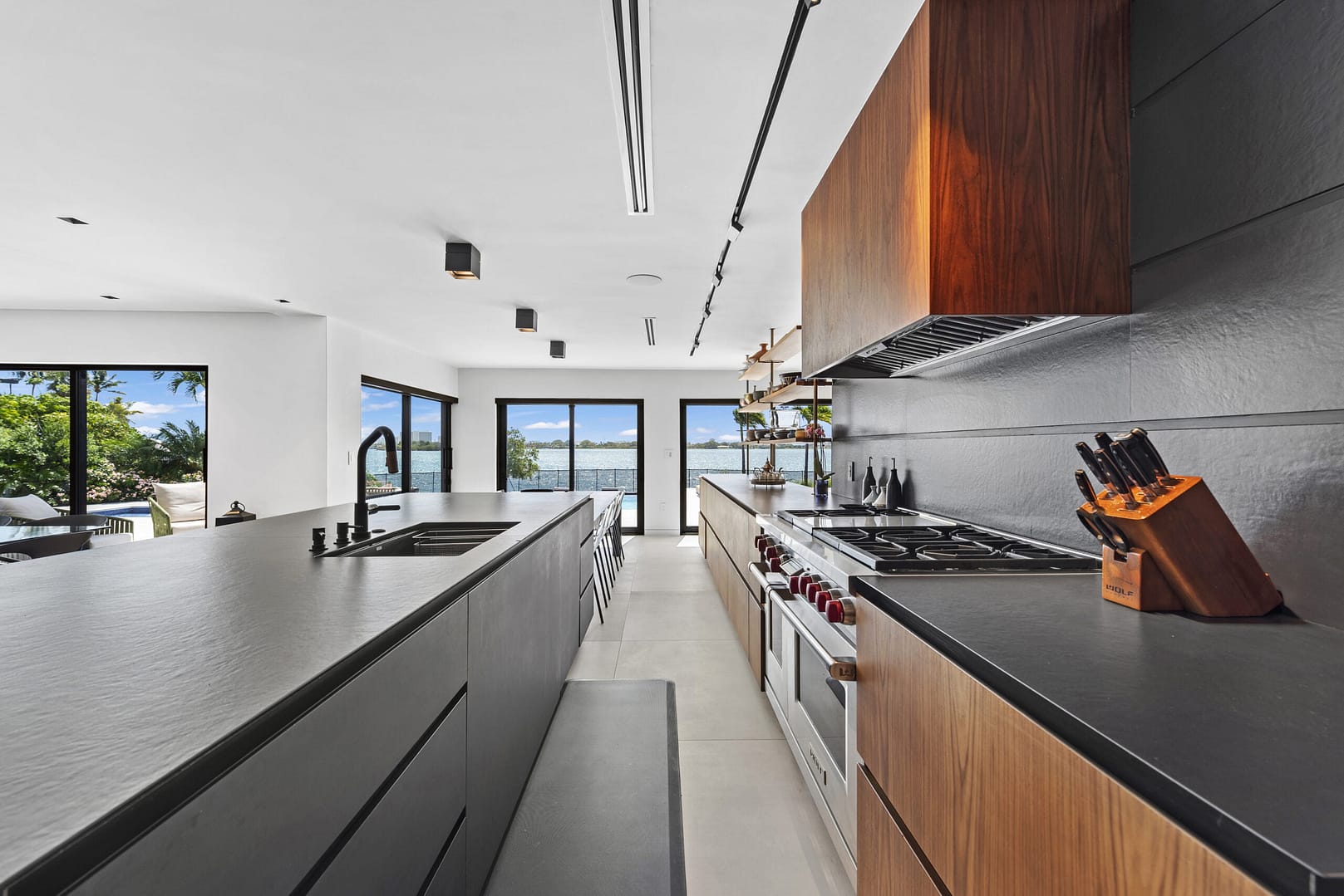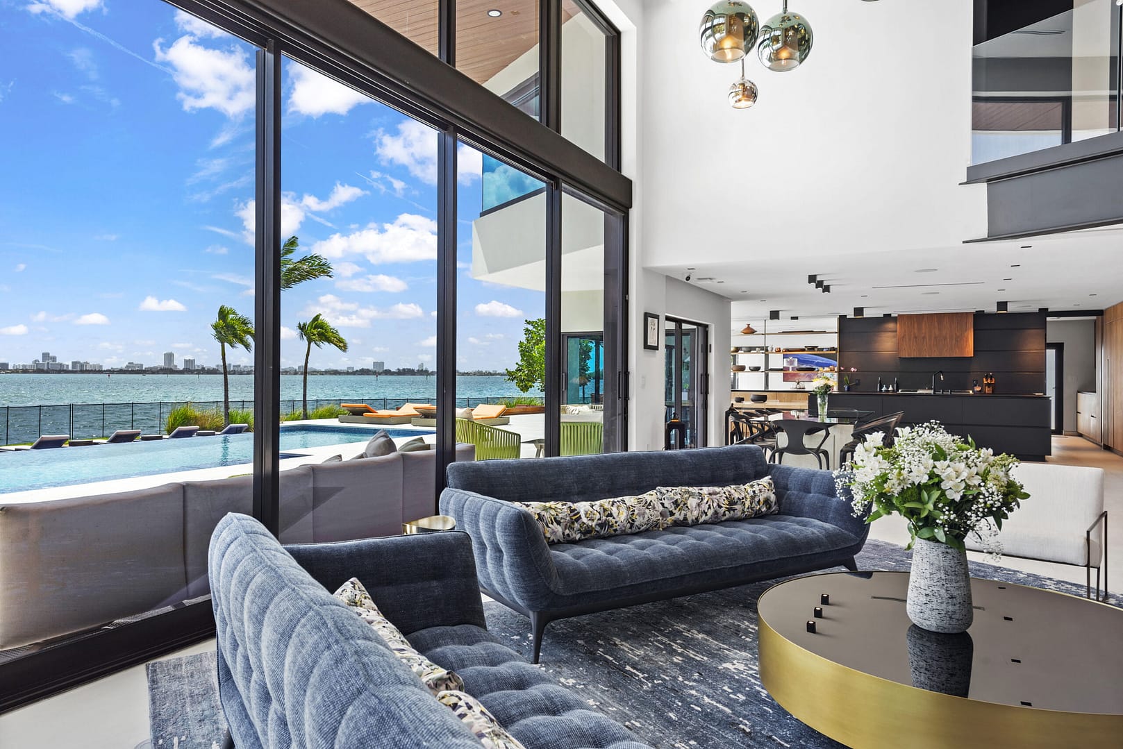 bay views. Inside, a state-of-the-art kitchen sits between the living, formal dining, & family room all