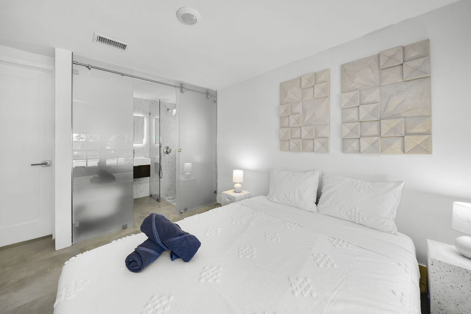 - Master Suite: King bed, Walk In Closet with custom Built-In Cabinets, Luxury Ensuite Bathroom with Rainfall shower, double vanity, and Tub (which can be exposed to the room/pool view via slider door