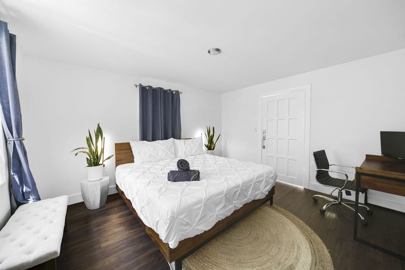 - King Bedroom: King Bed and work desk with a premium curved monitor