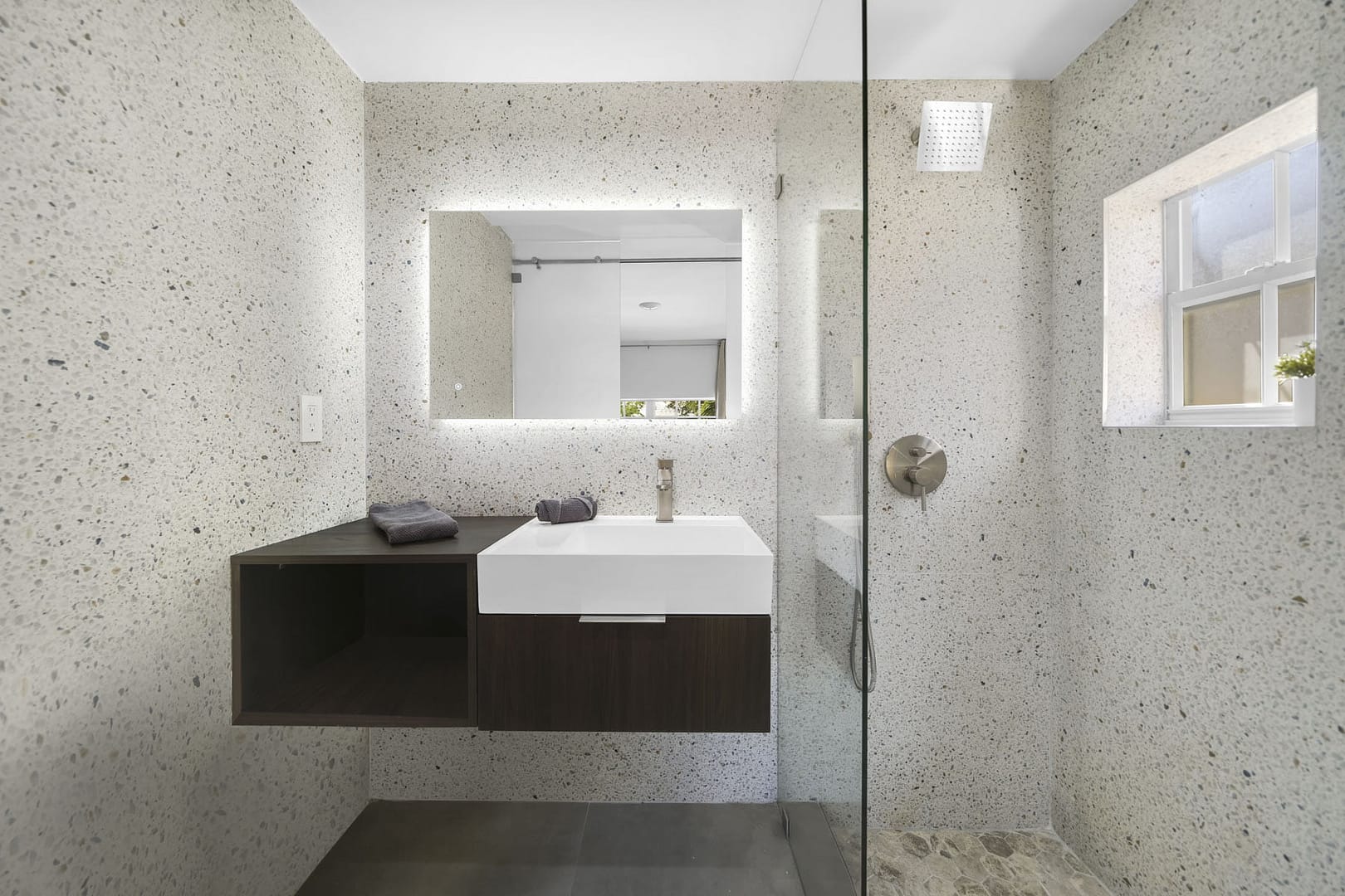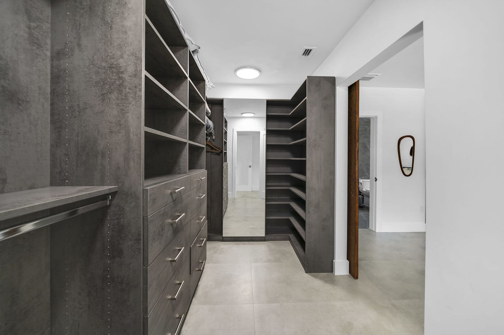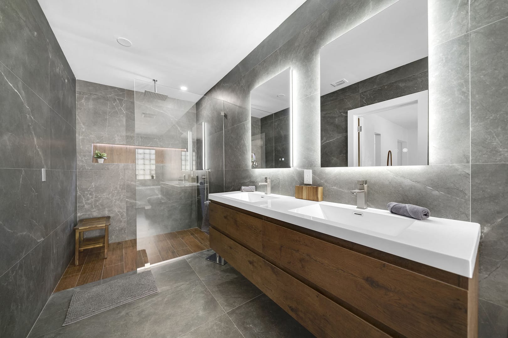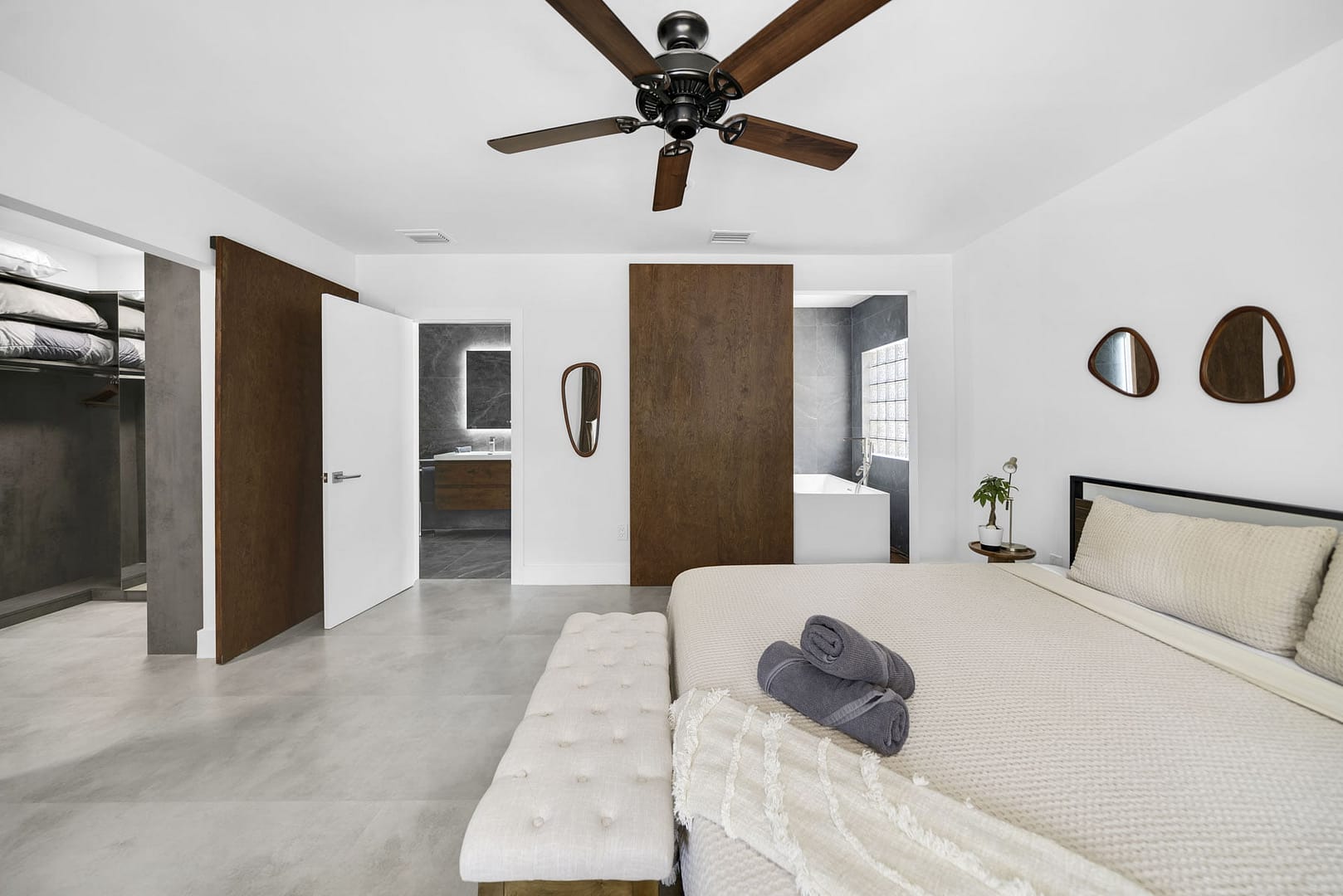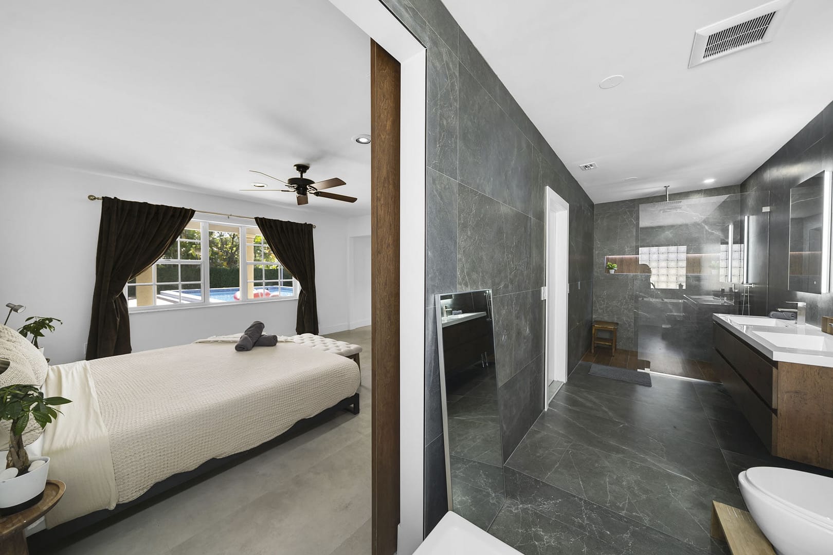 - Master Suite: King bed, Walk In Closet with custom Built-In Cabinets, Luxury Ensuite Bathroom with Rainfall shower, double vanity, and Tub (which can be exposed to the room/pool view via slider door