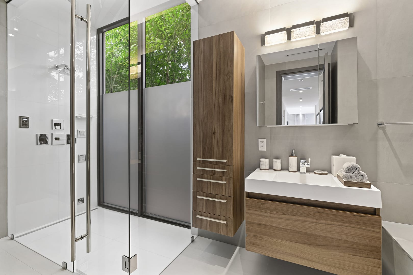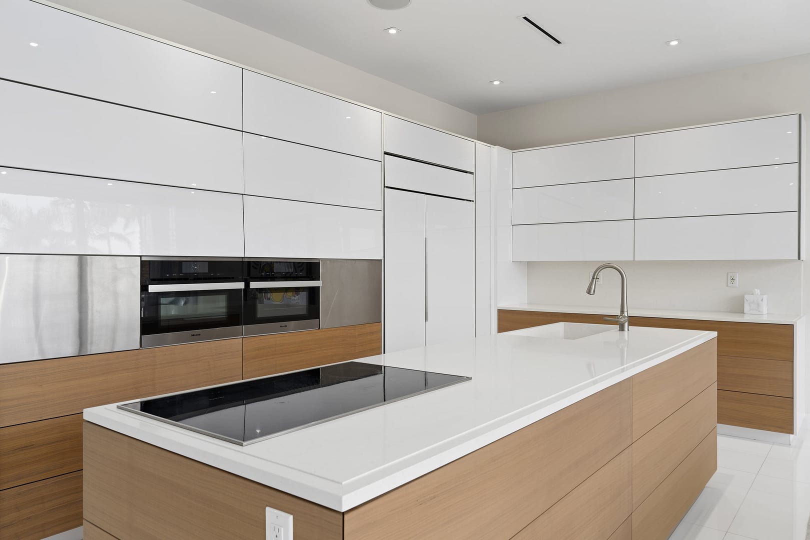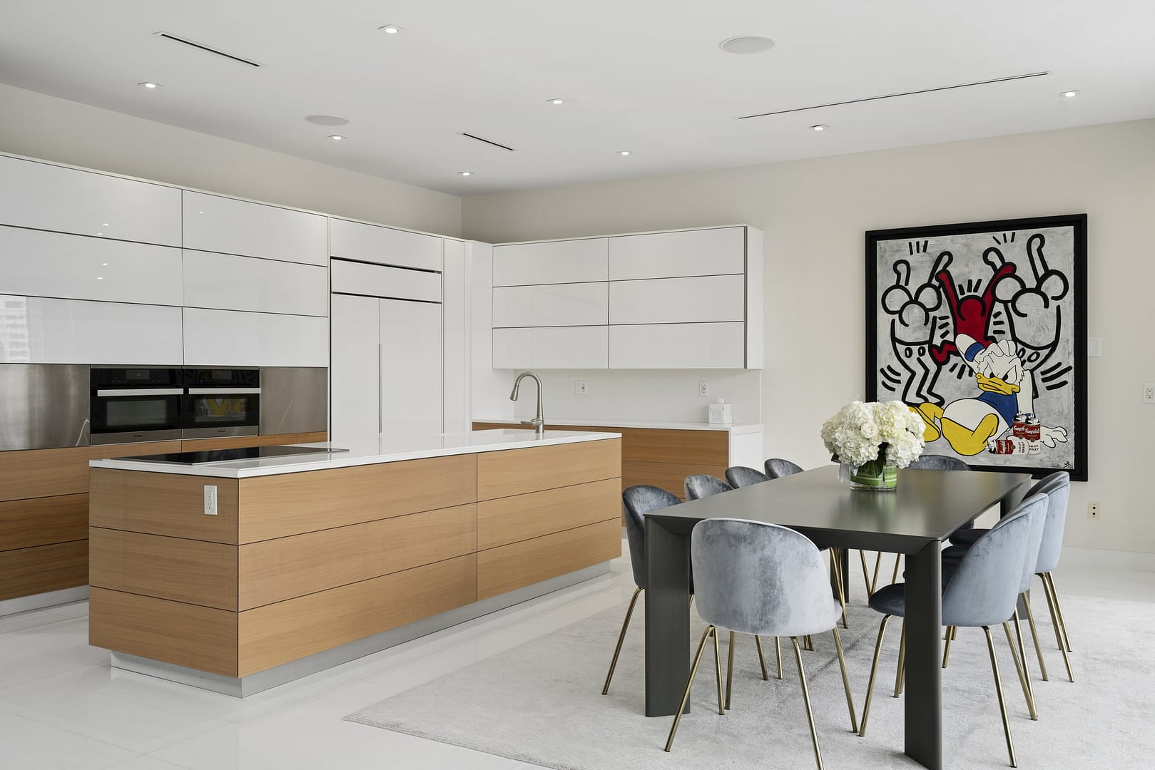 Featuring glass window walls with wide intra coastal views, white glass and wood