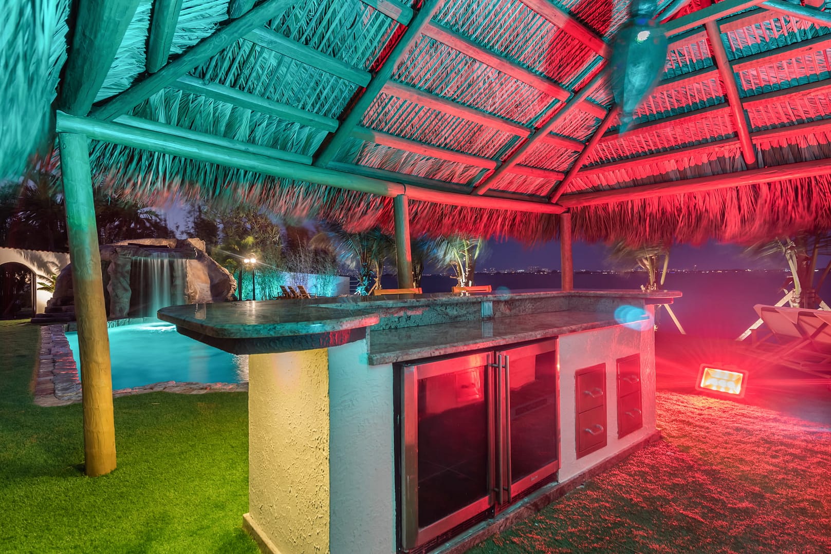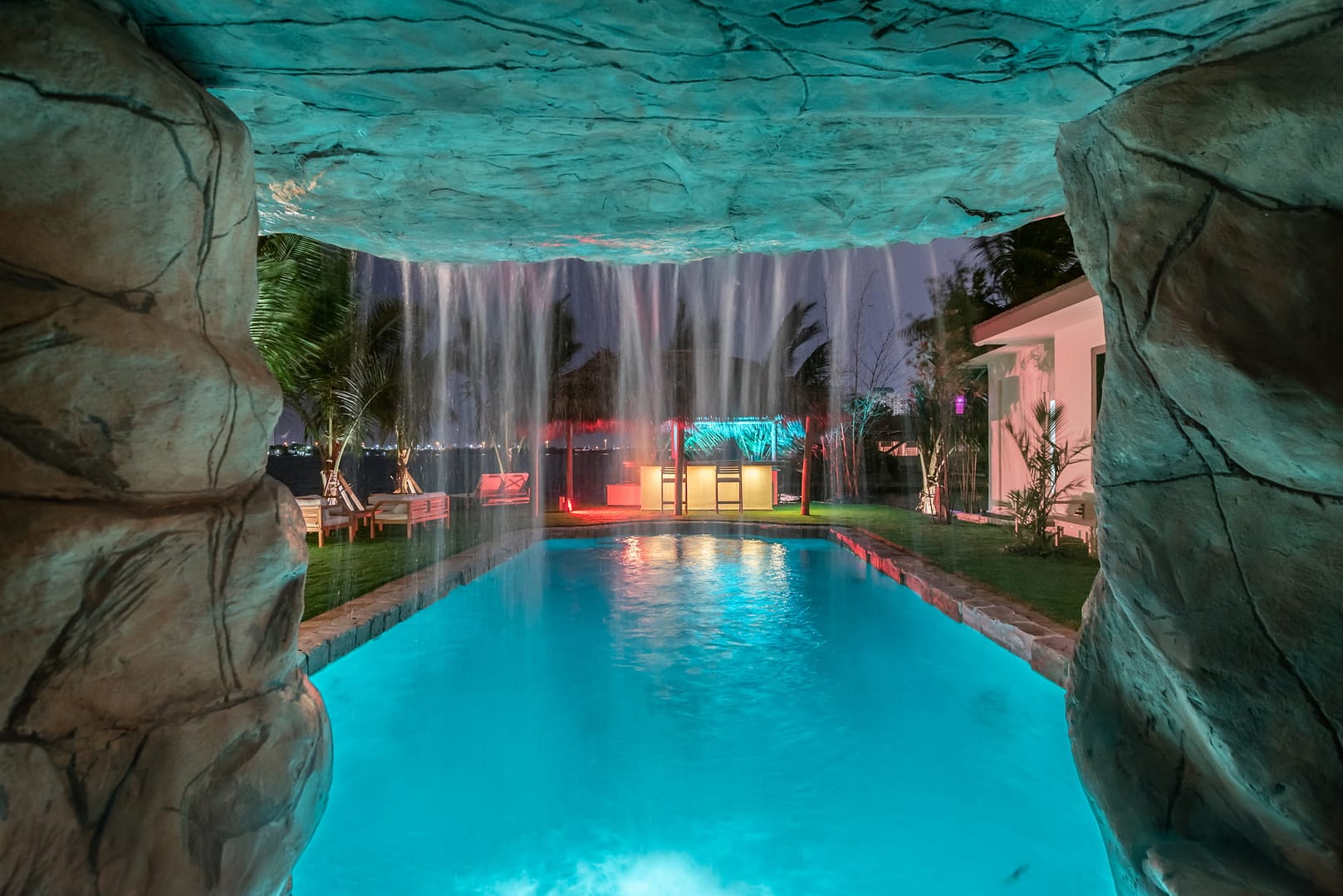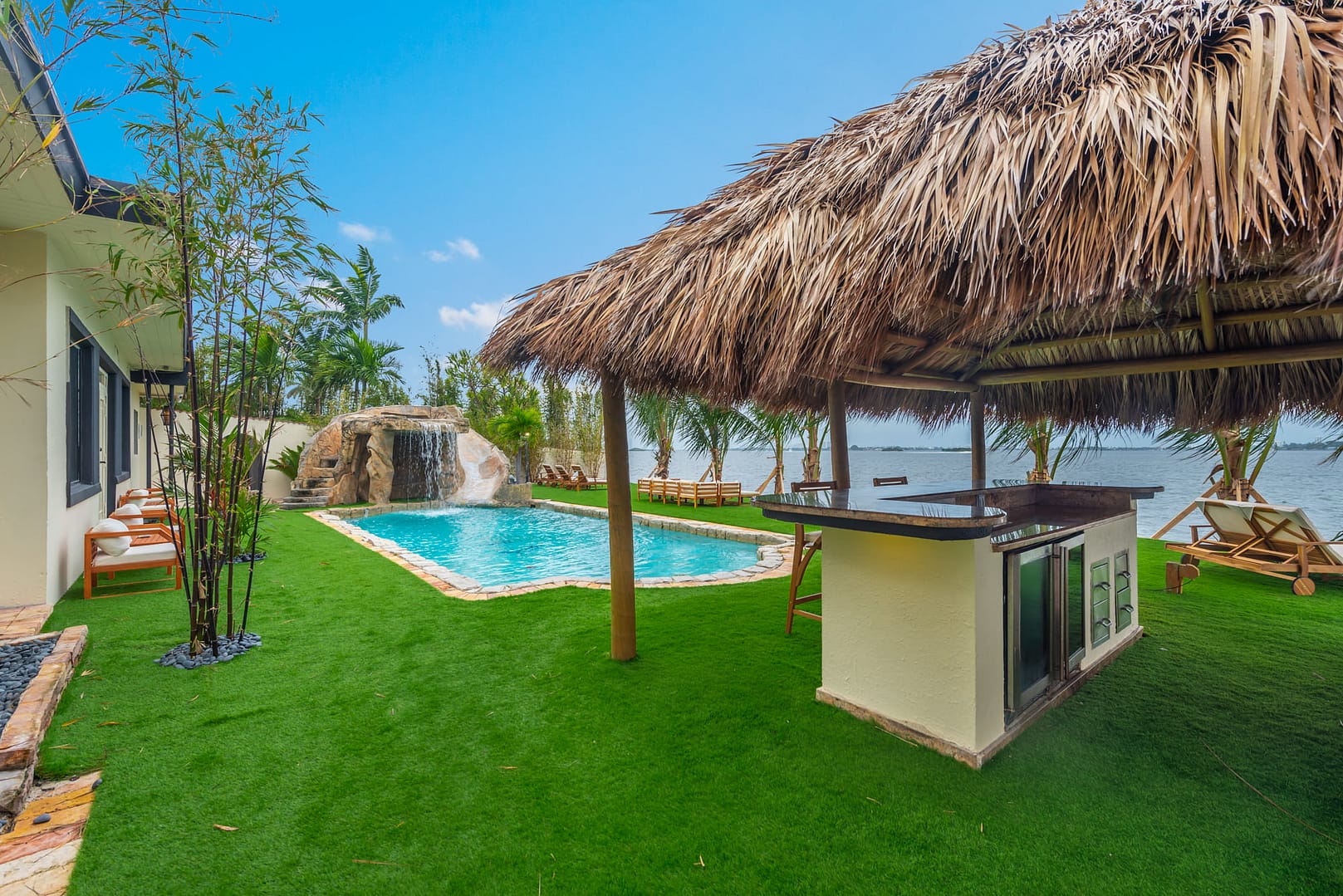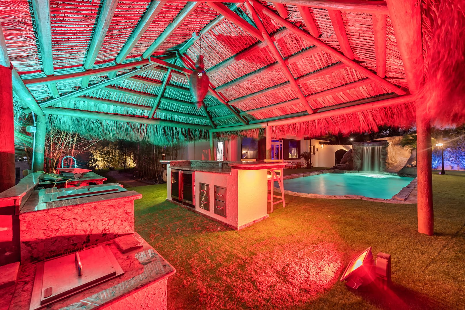 waterfall and outdoor kitchen.