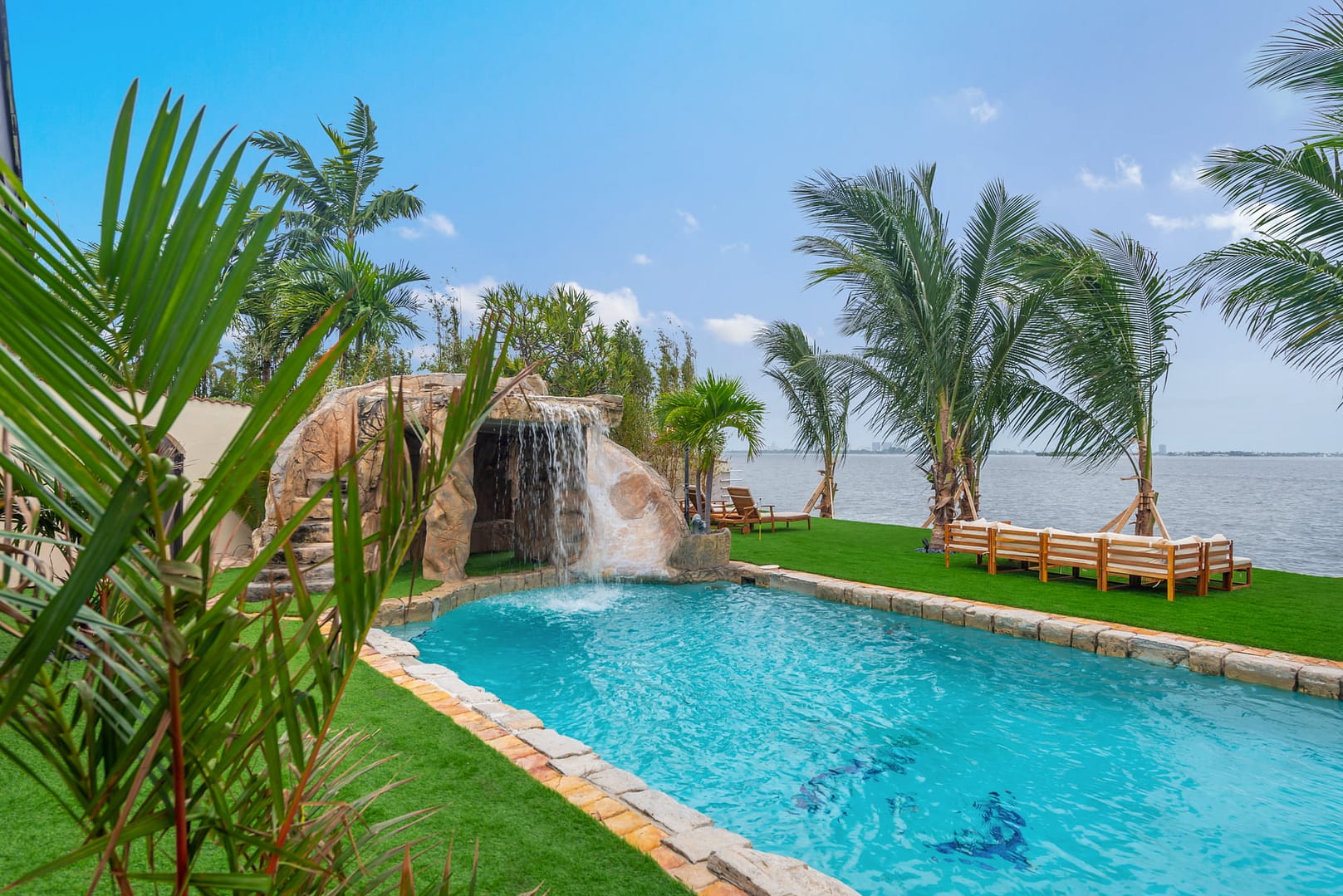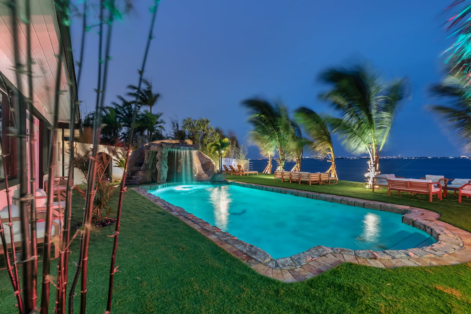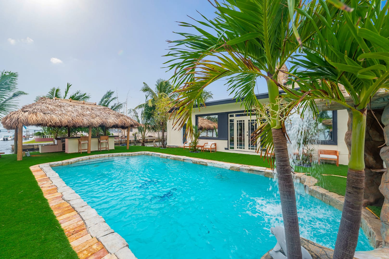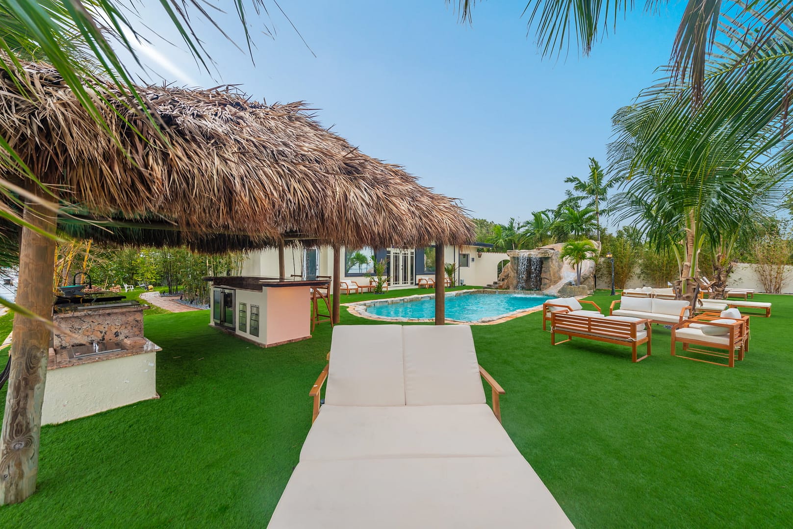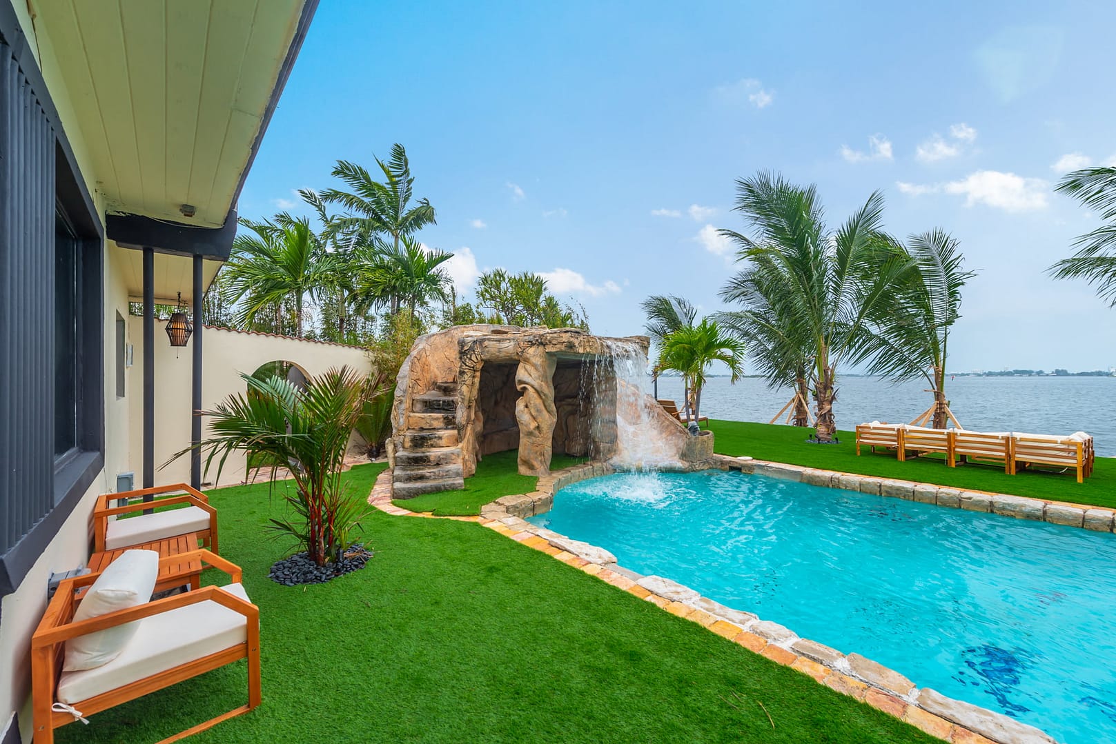 waterfall and outdoor kitchen.
