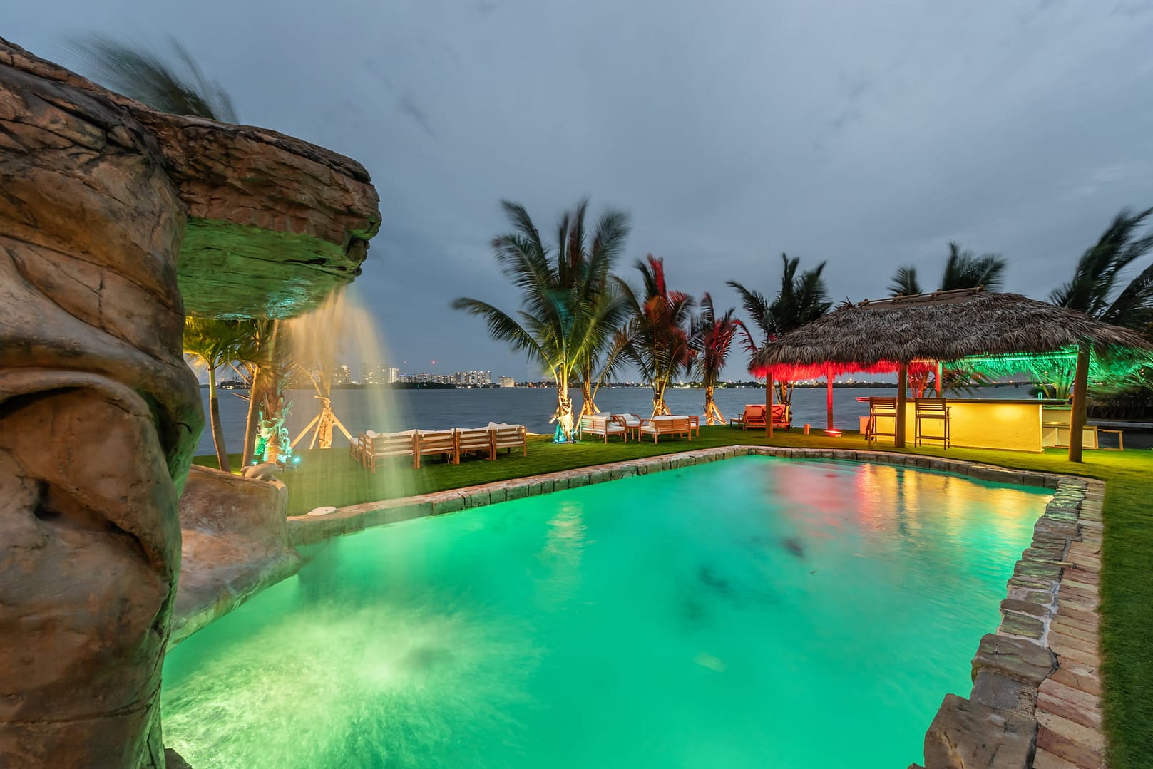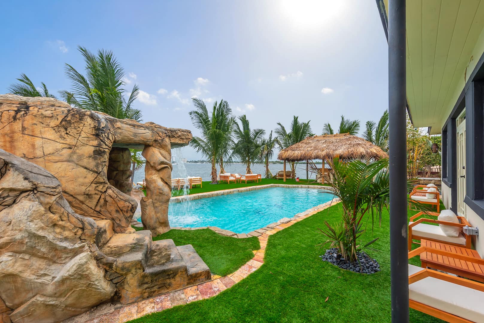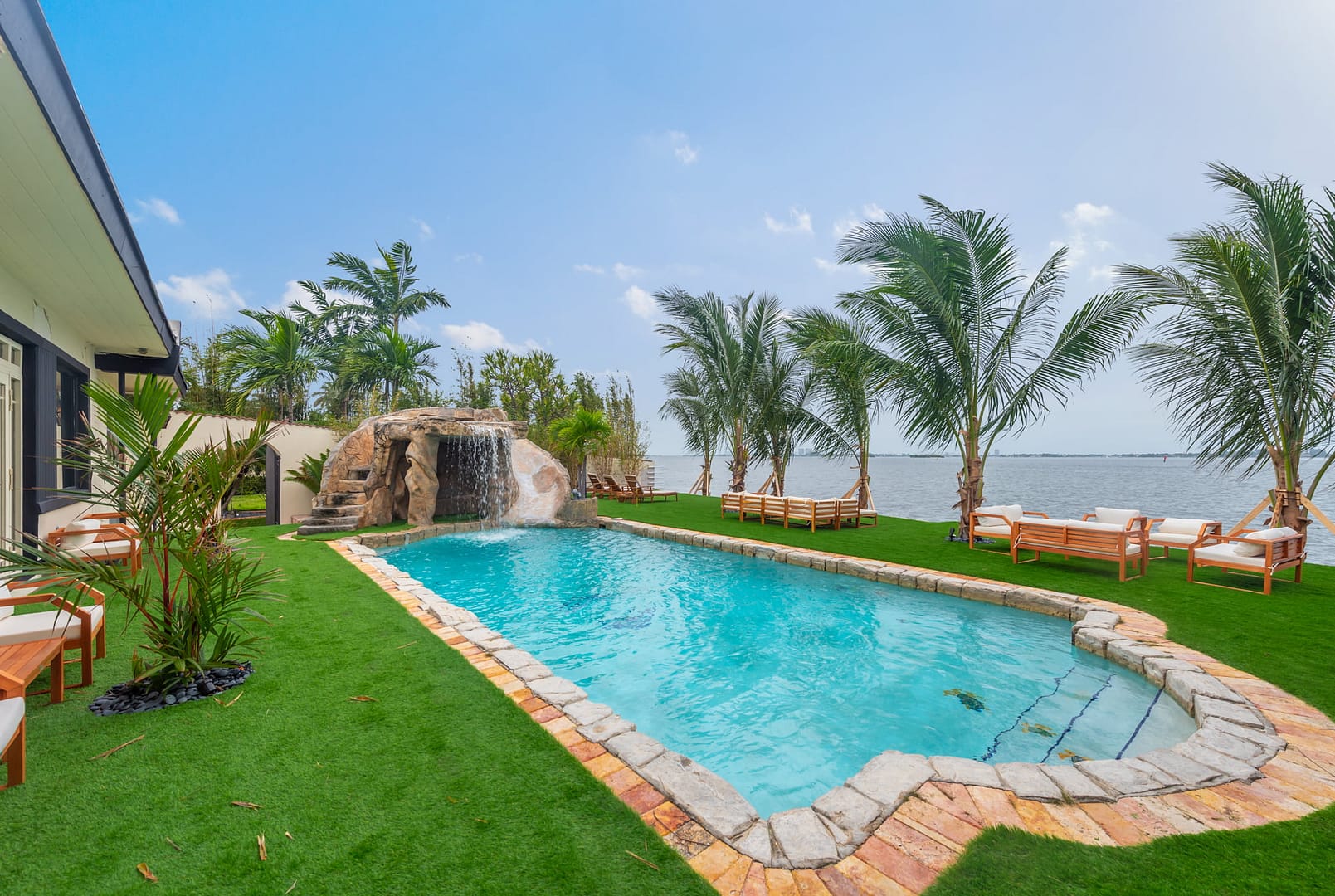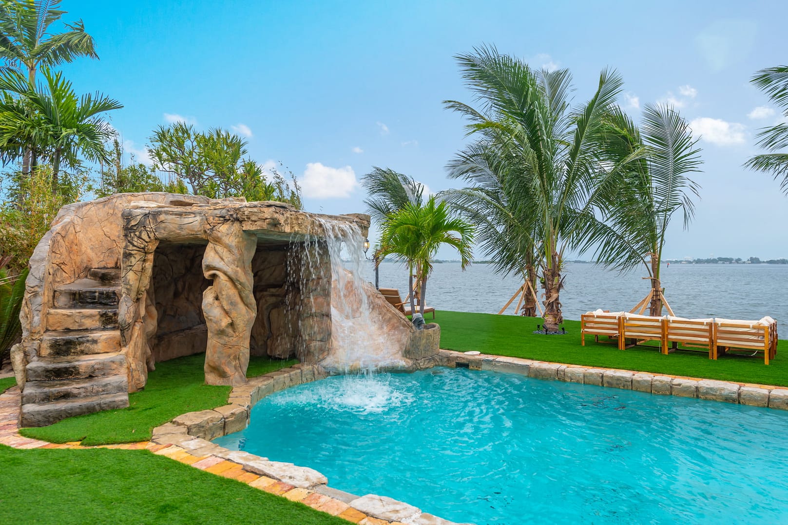 waterfall and outdoor kitchen.