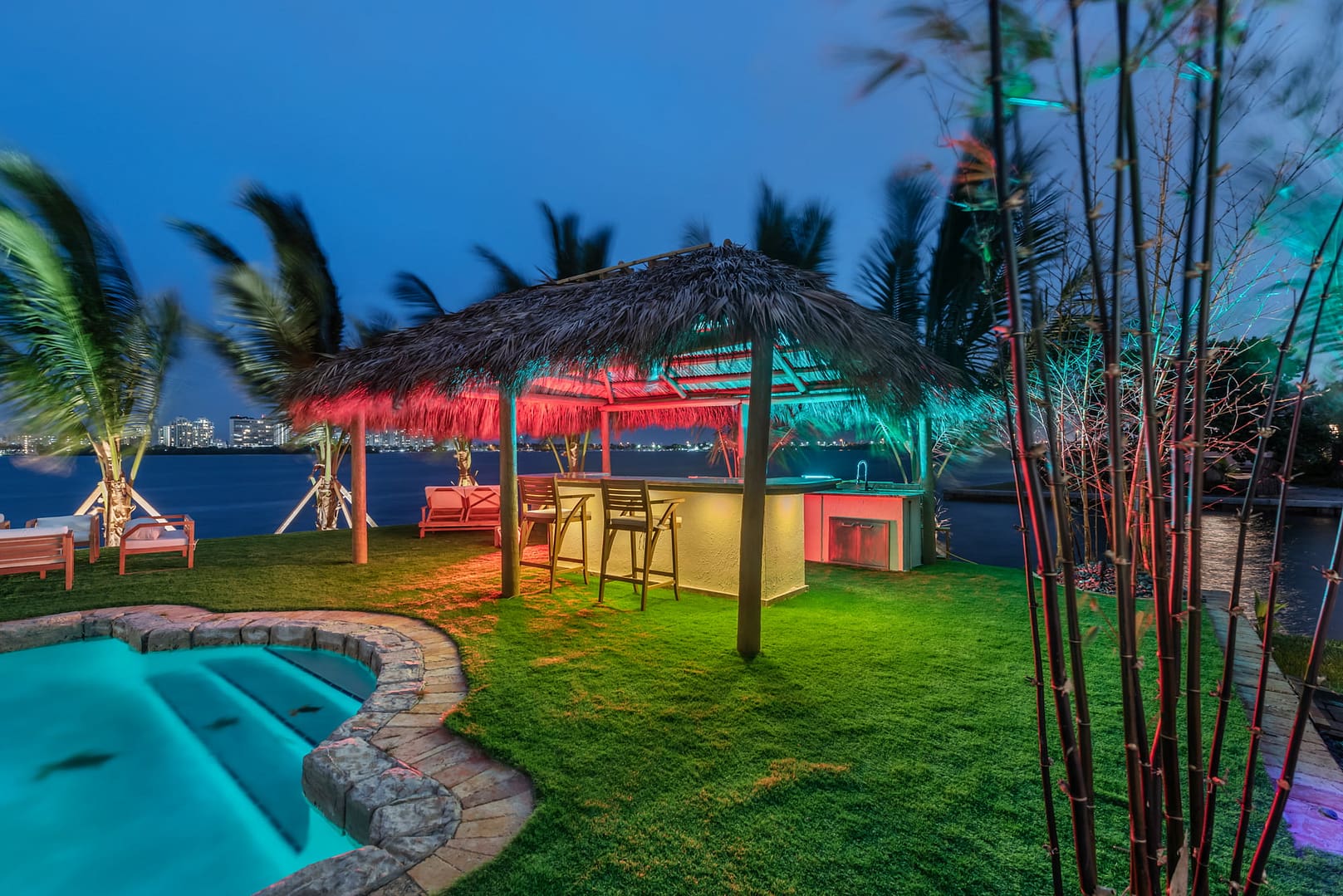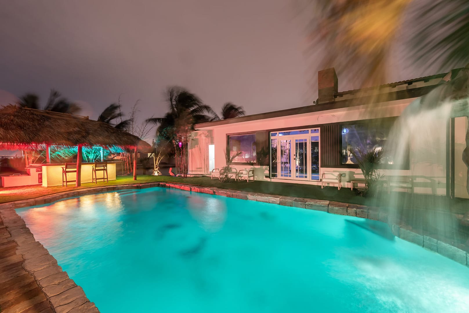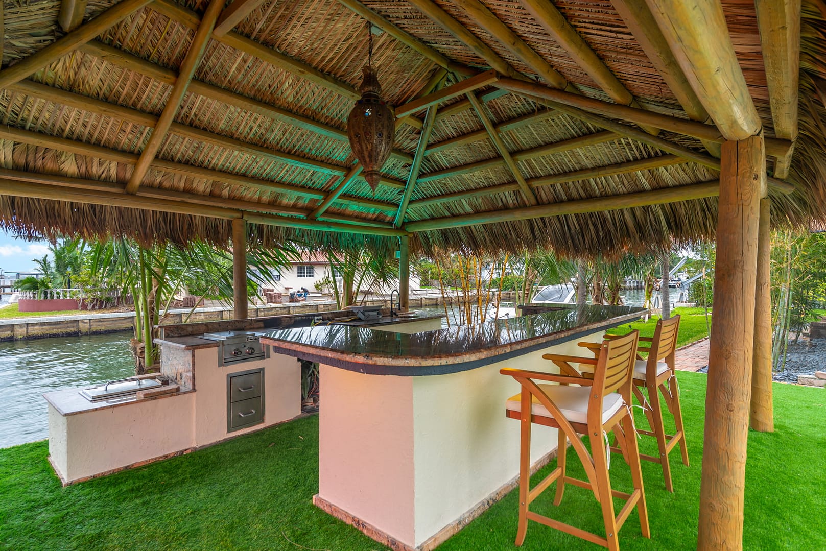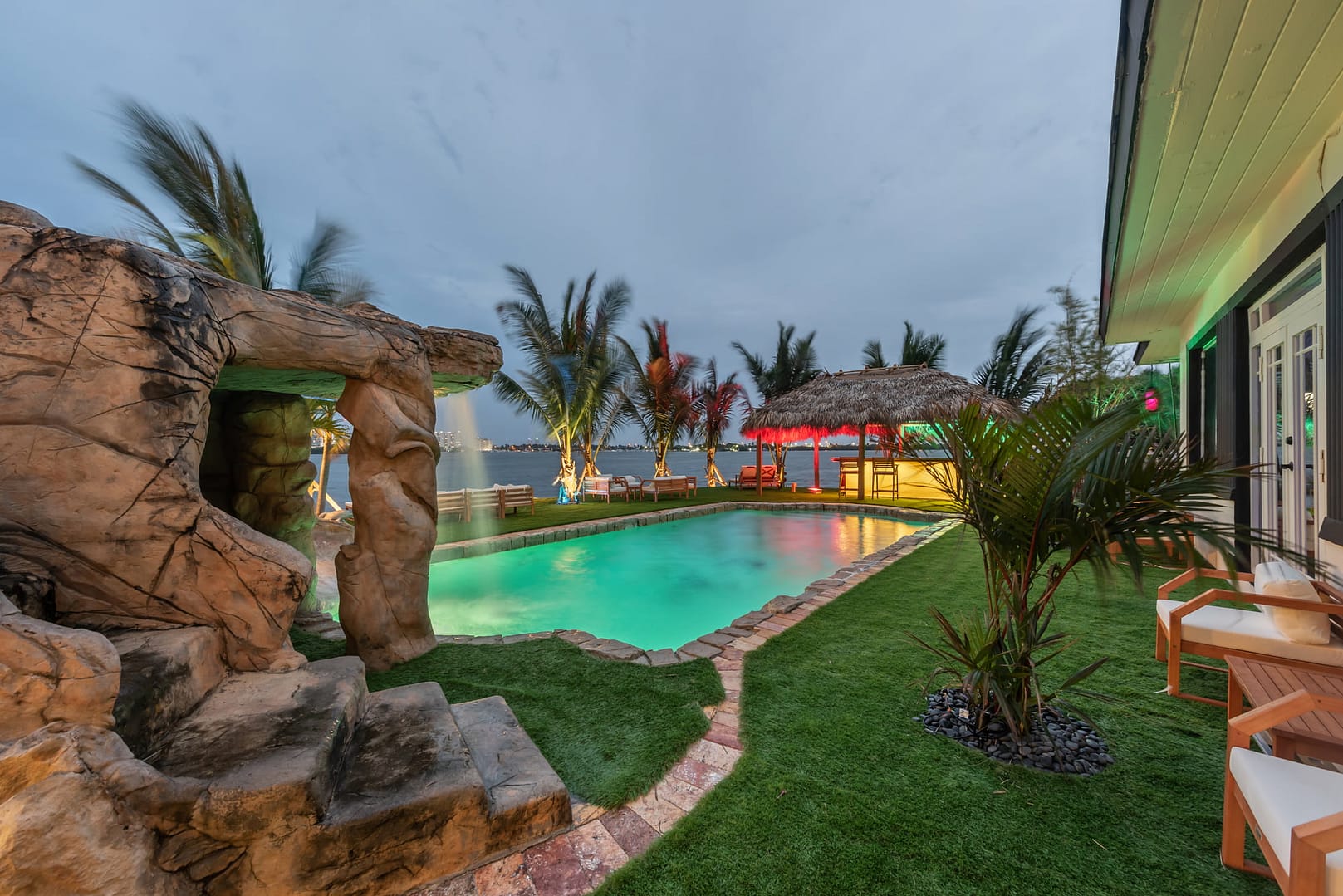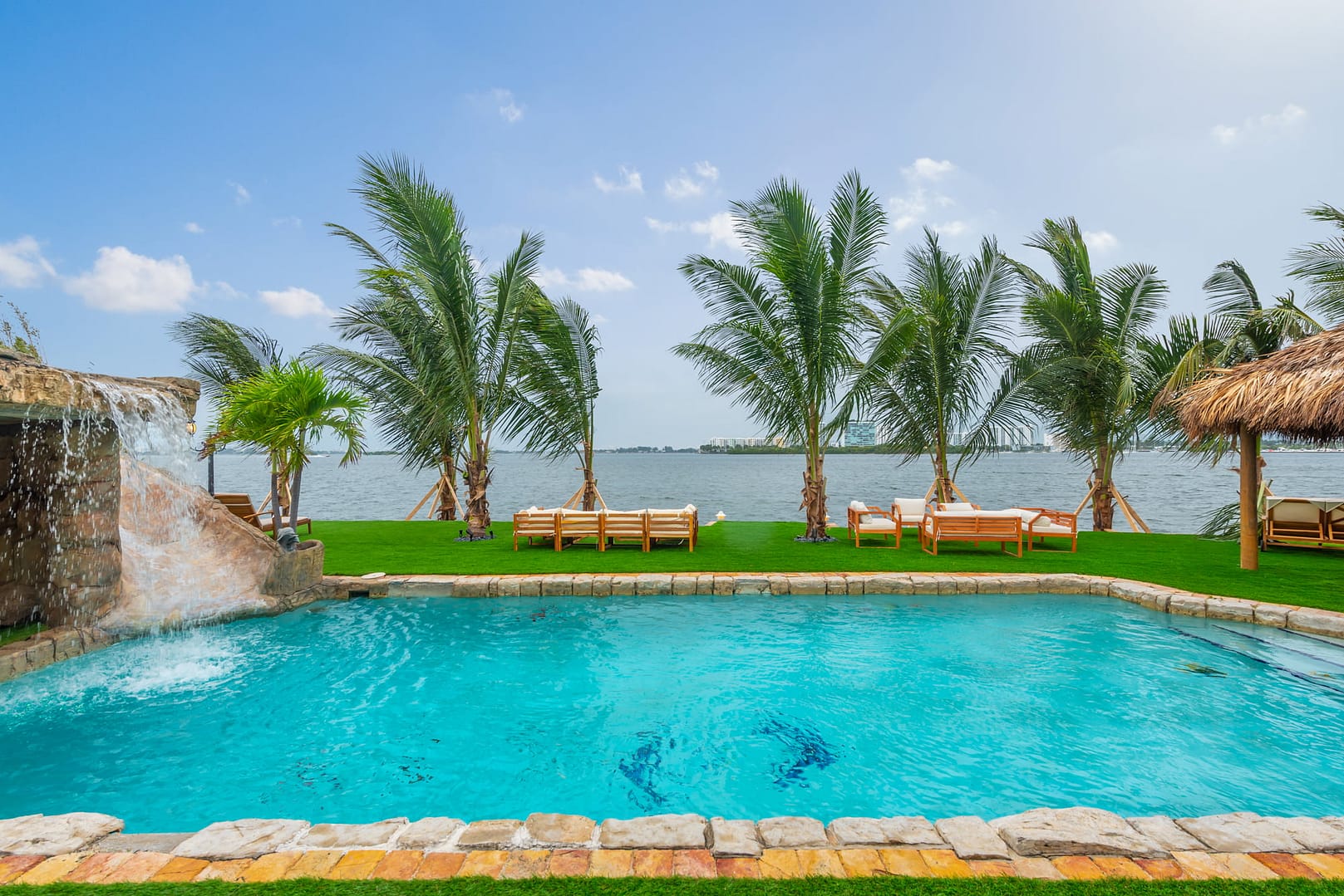 waterfall and outdoor kitchen.