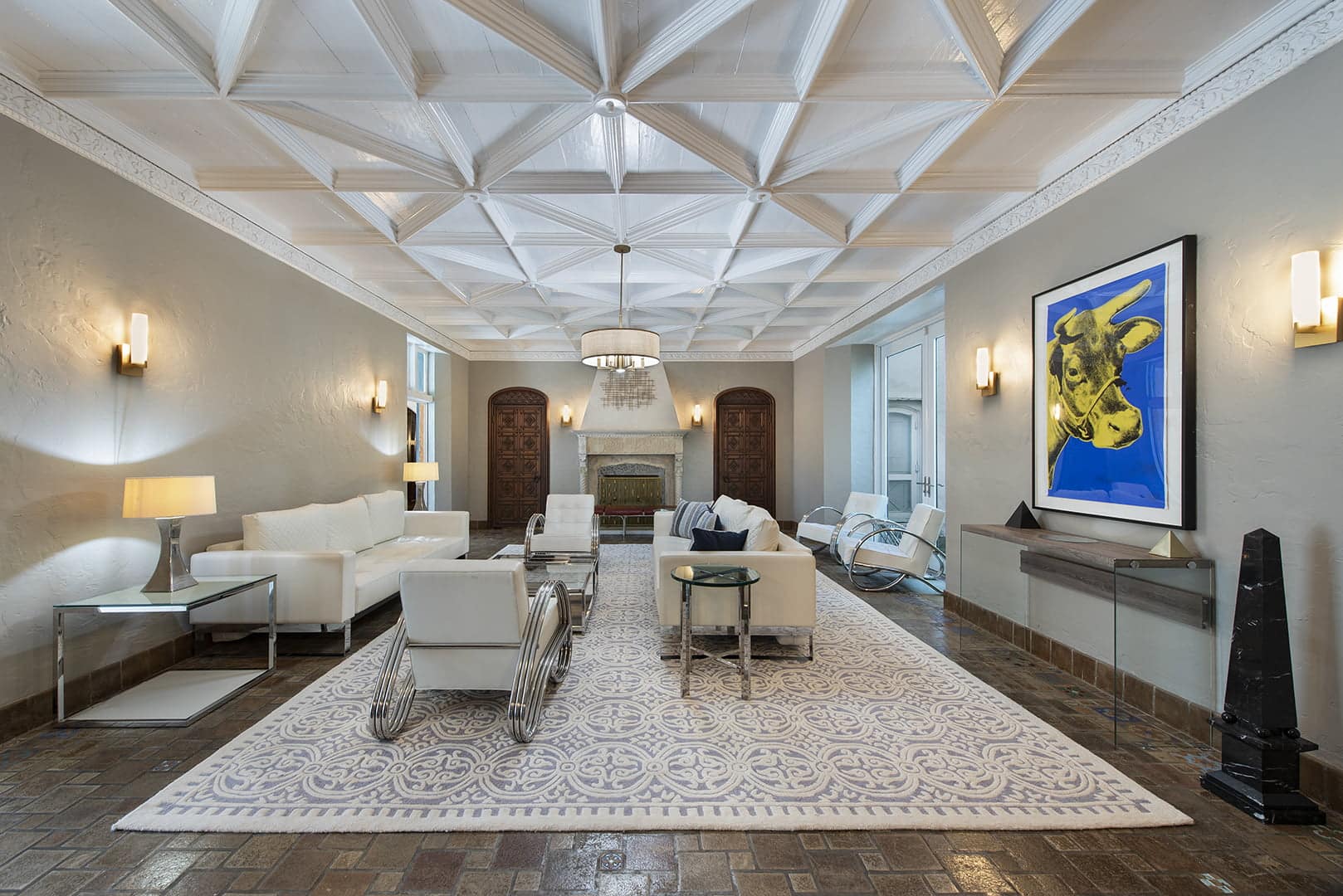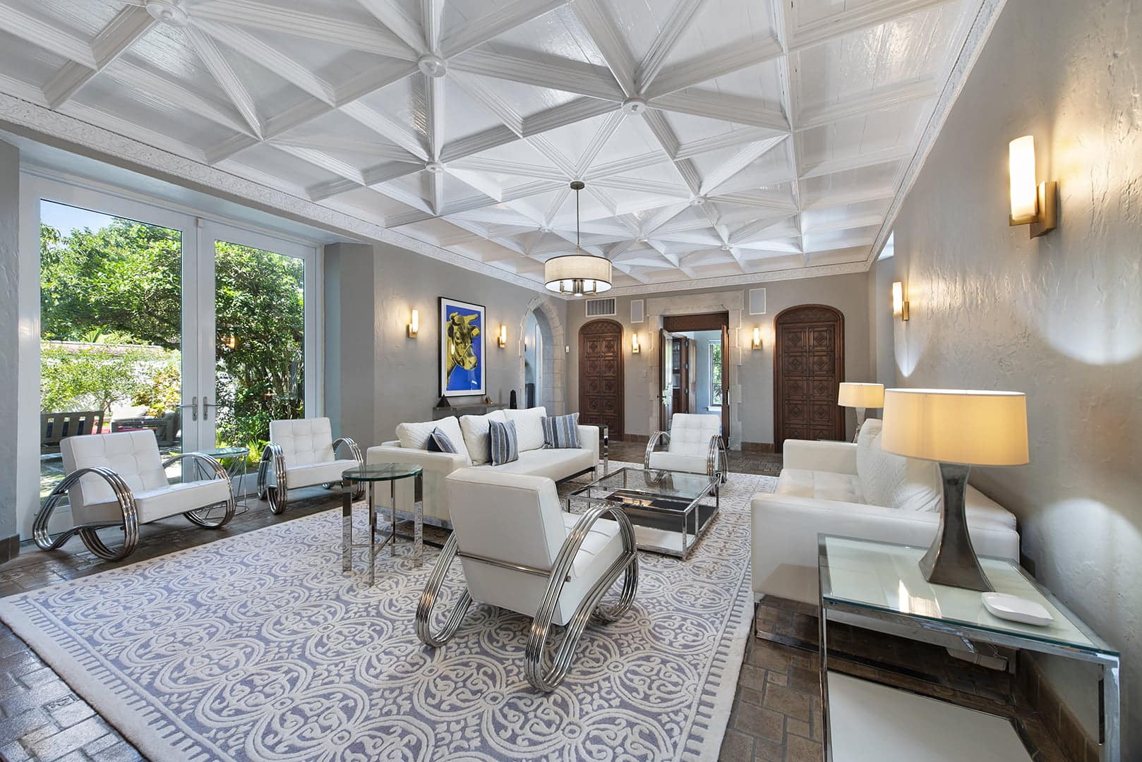 The grand salon, with its soaring coffered ceilings and custom-built-ins, exudes elegance and