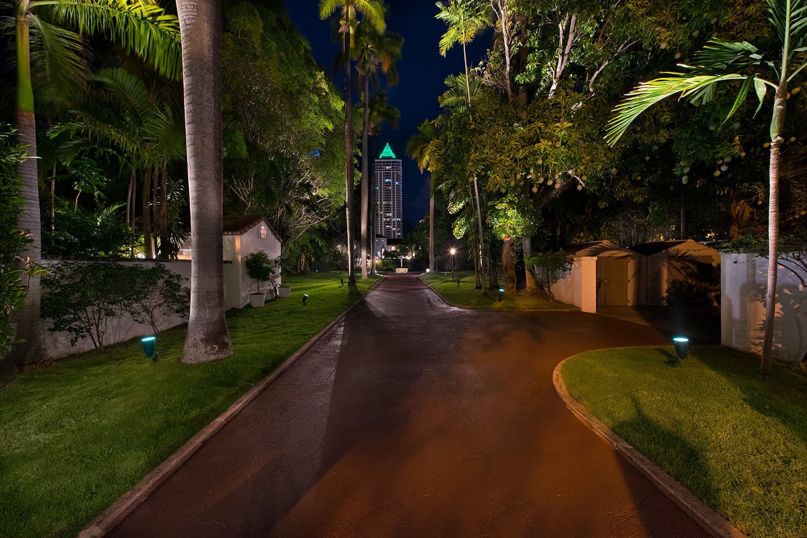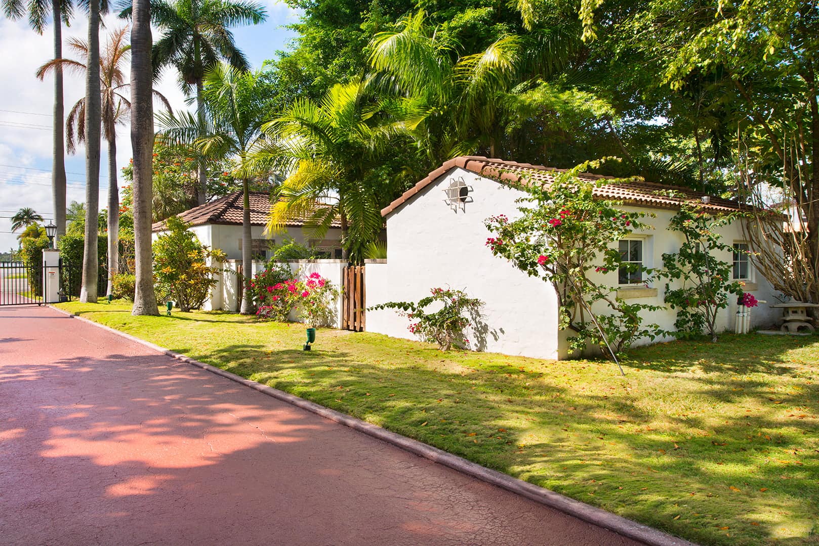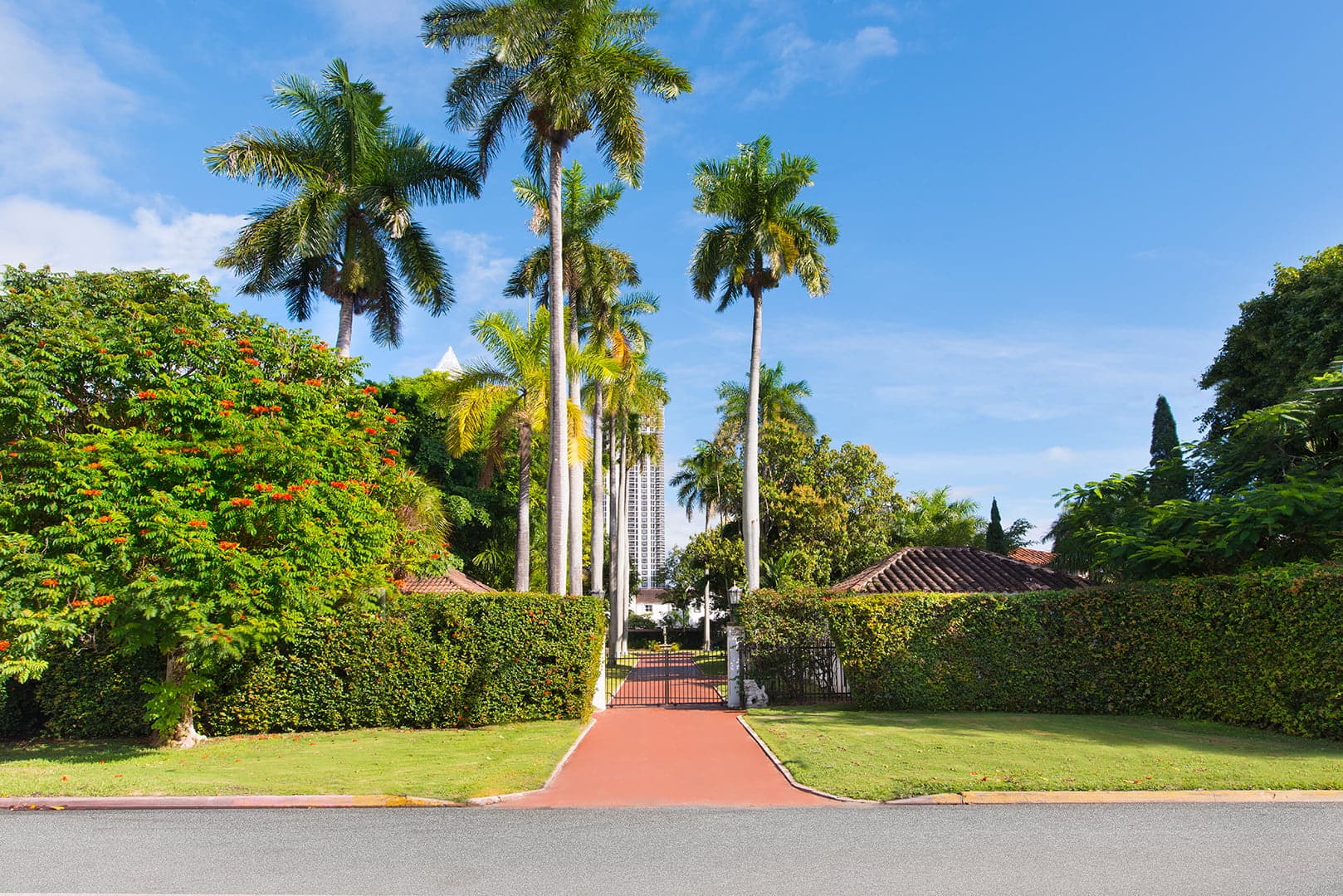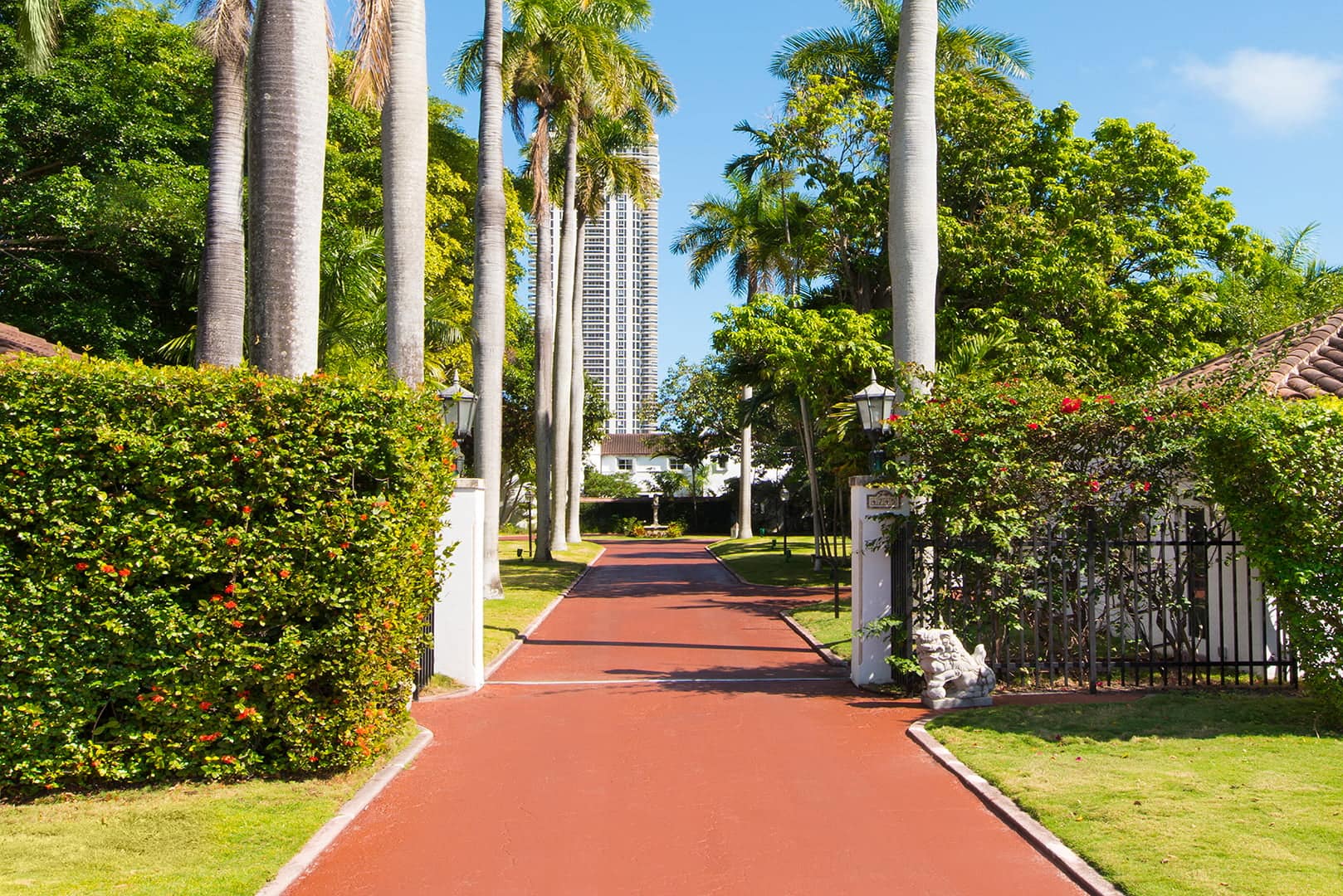 Behind the iron gates sits the long driveway, lined with majestic royal palms, creating a