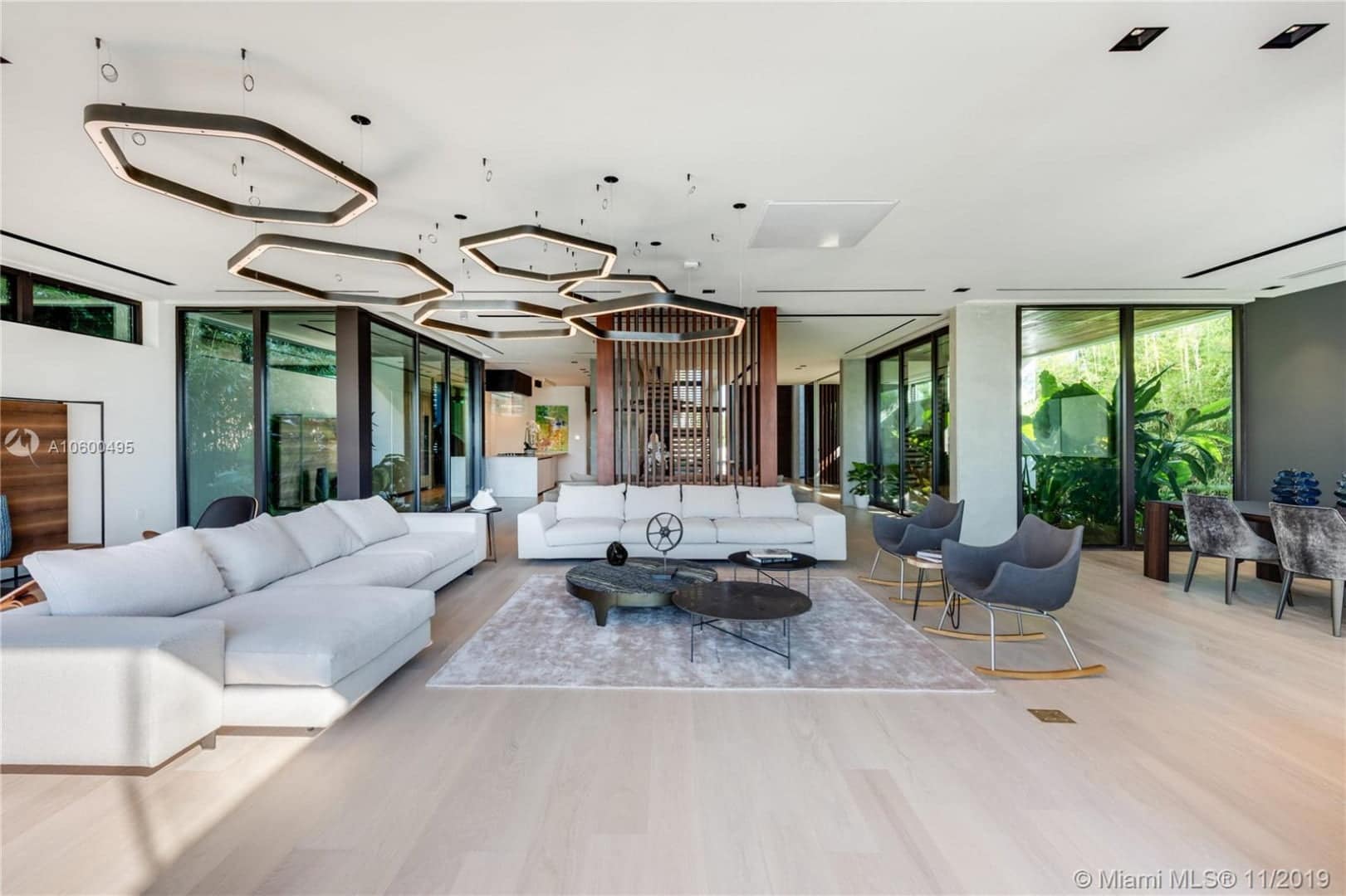 features an open concept floor-plan with a family room, glass-enclosed office/bar, dining